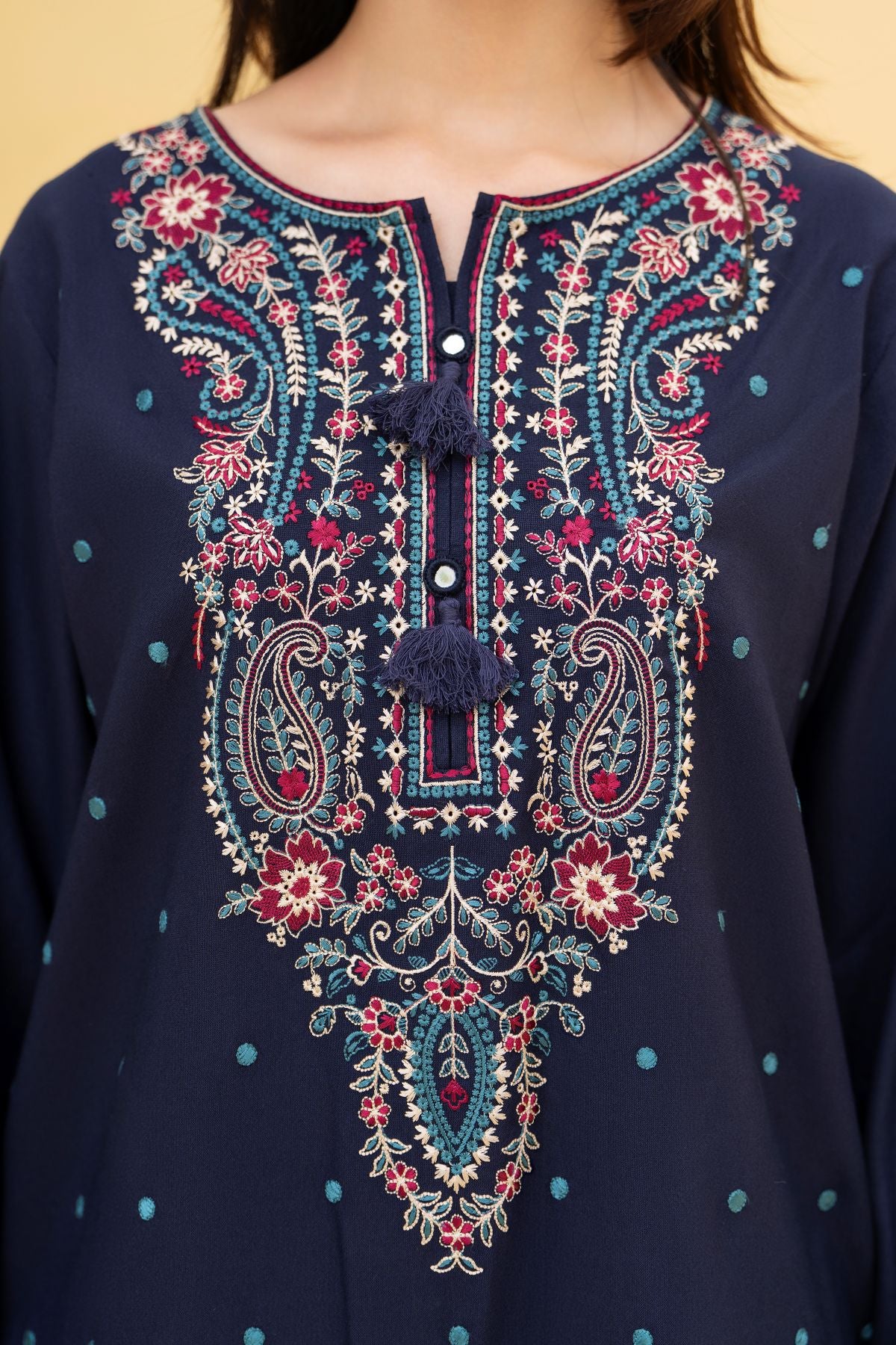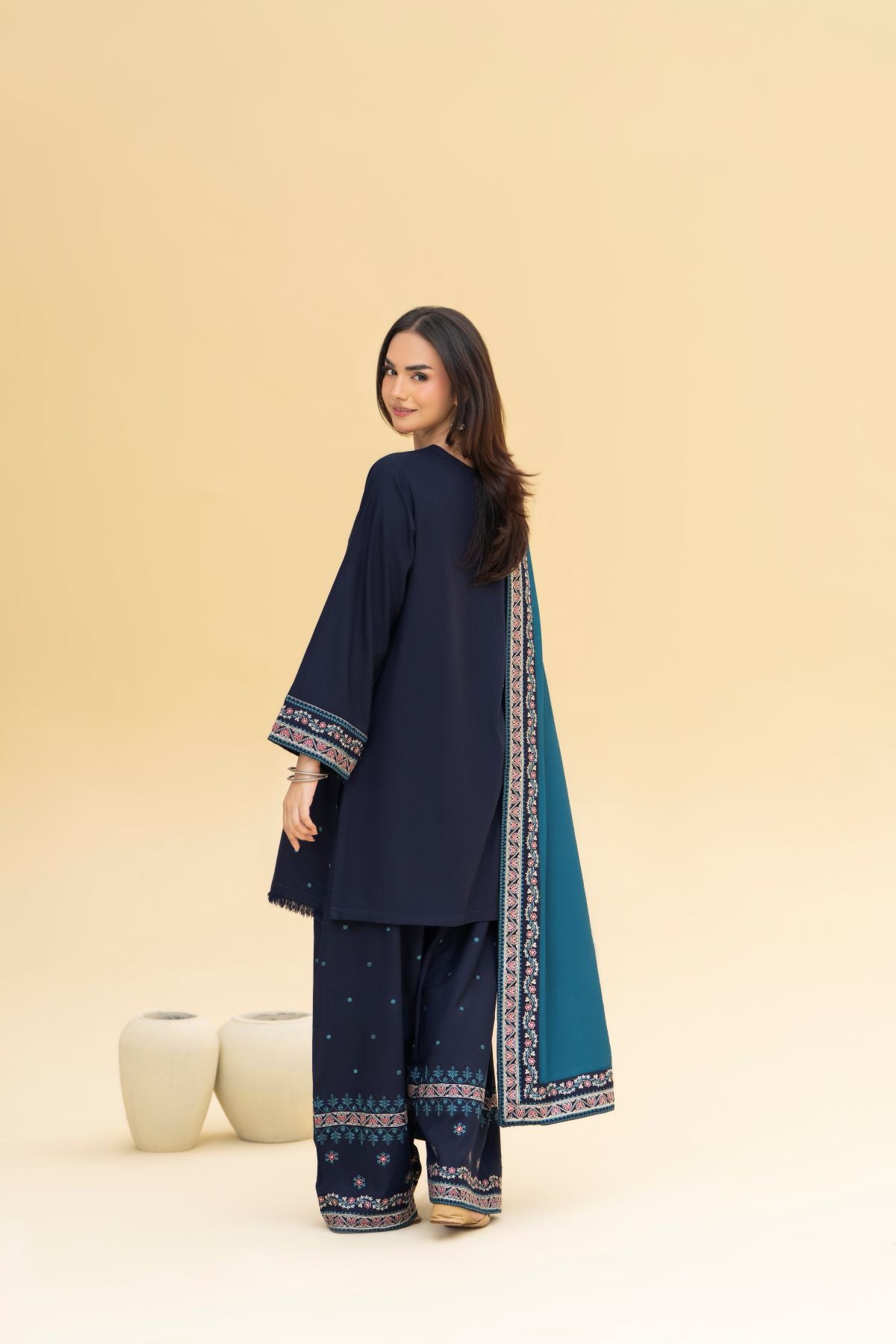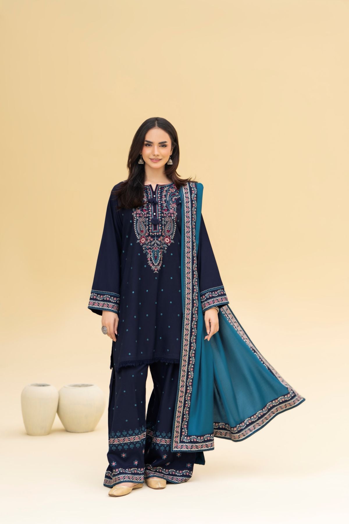 Embrace winter elegance with timeless charm. This deep blue embroidered shirt paired with a beautifully detailed farshi shalwar creates a regal, graceful silhouette. The look is completed with a teal blue embroidered shawl that adds a rich, contrasting touch. Perfect for festive evenings and winter gatherings, this ensemble blends warmth, luxury, and sophistication.