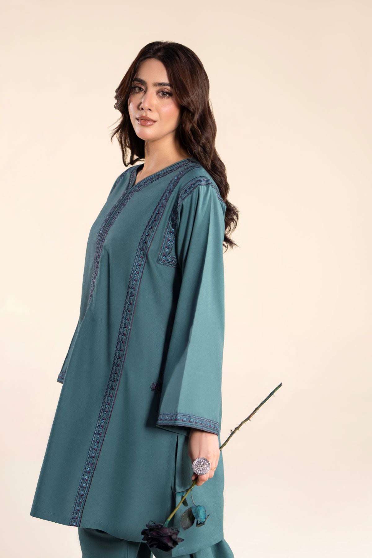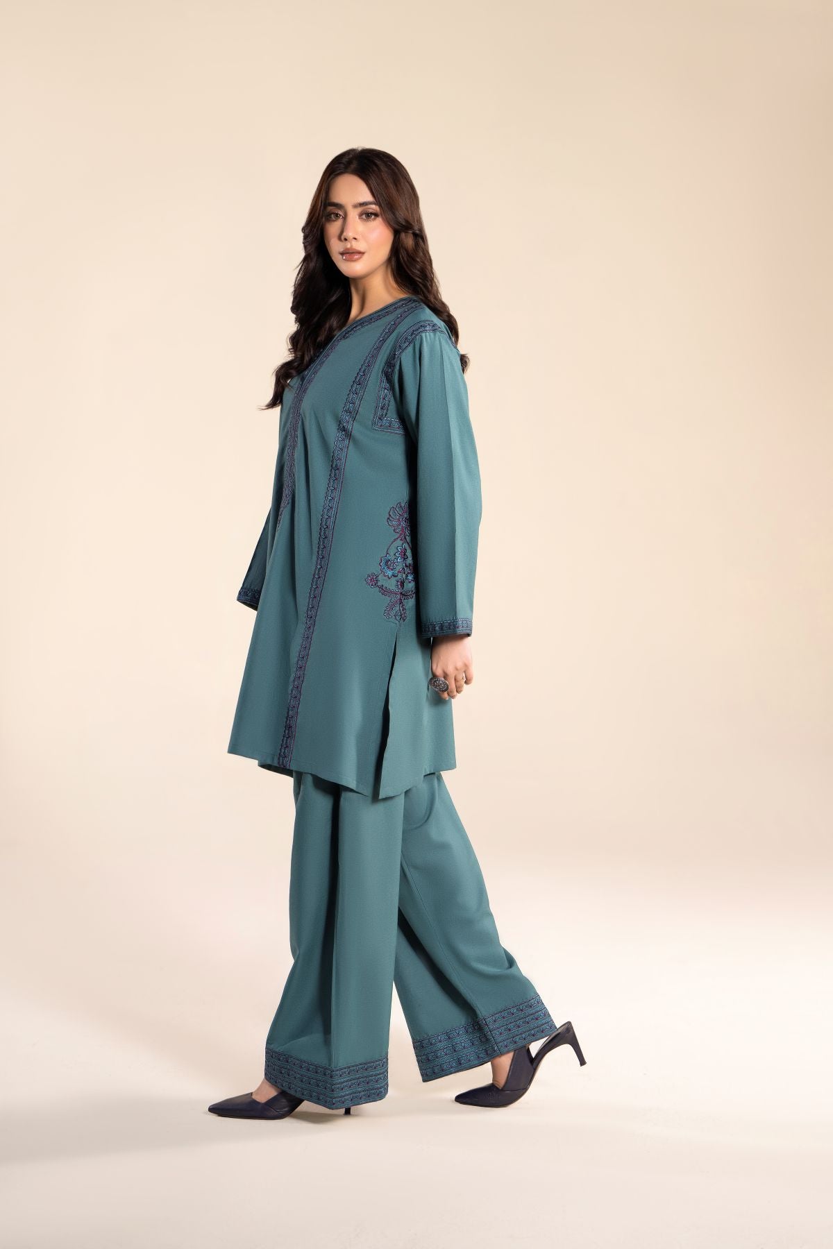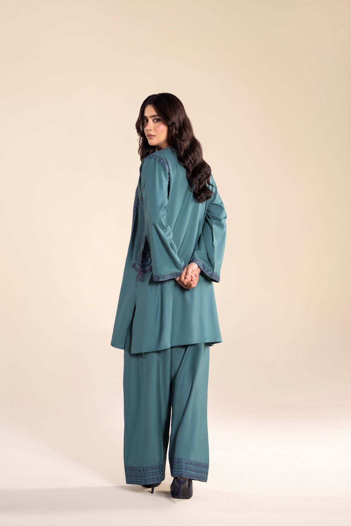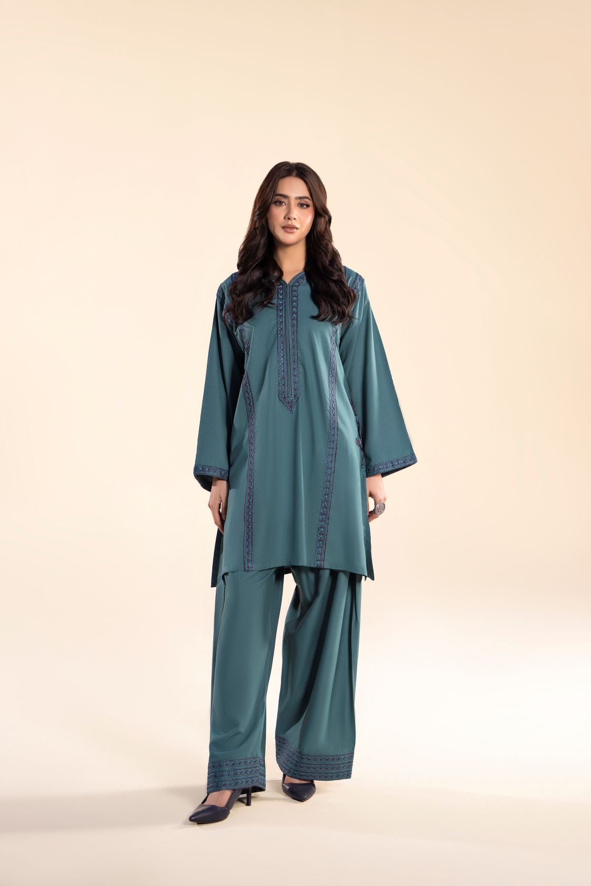 Add a splash of elegance to your wardrobe with this vibrant sea green two-piece set, featuring delicate embroidery on a chic short shirt. Paired with a flowing farshi shalwar, it offers comfort without compromising on style. It’s designed to keep you looking effortlessly stylish all day long.