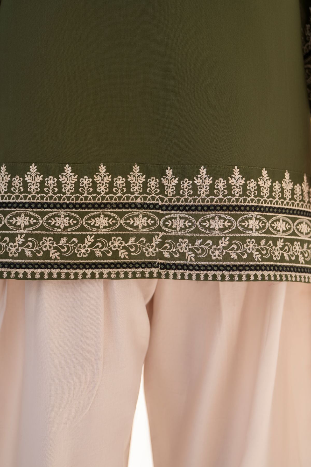 Olive Green embroidered short shirt paired with a flowing farshi shalwar and matching embroidered dupatta, crafted in breathable cotton lawn. Rich festive detailing makes it perfect for Eid celebrations and Ramadan gatherings. A graceful 3-piece ensemble blending tradition, comfort, and timeless elegance.