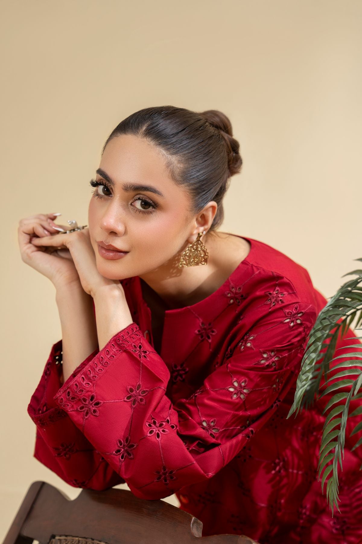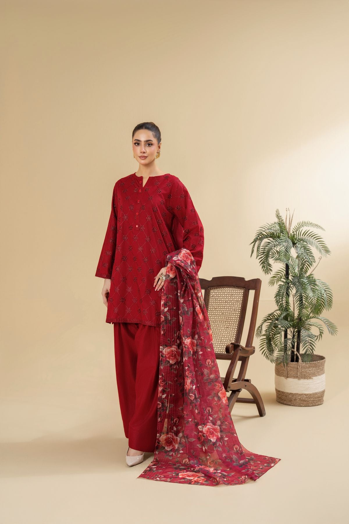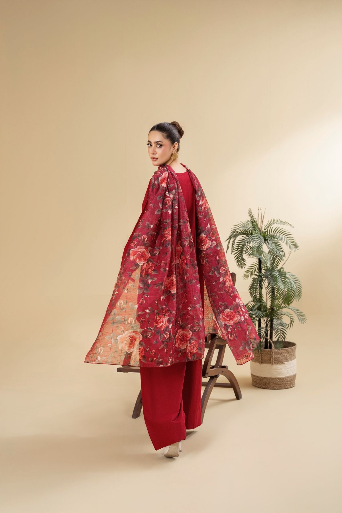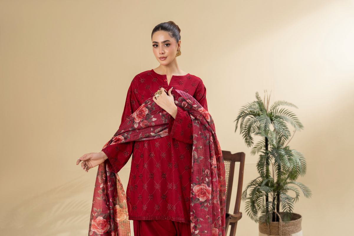 Radiate confidence and charm in Crimson Aura, a rich symphony of deep red hues. The shirt is adorned with subtle chickenkari, adding a touch of understated elegance. Accompanied by perfectly matched shalwar and a captivating floral printed dupatta in complementing tones. Crimson Aura is designed to make a striking statement wherever you go.
