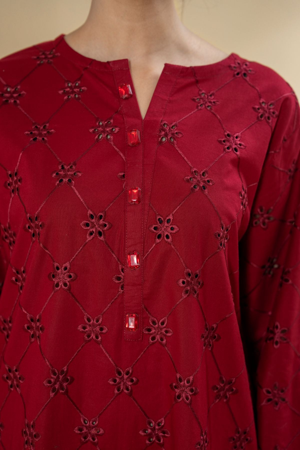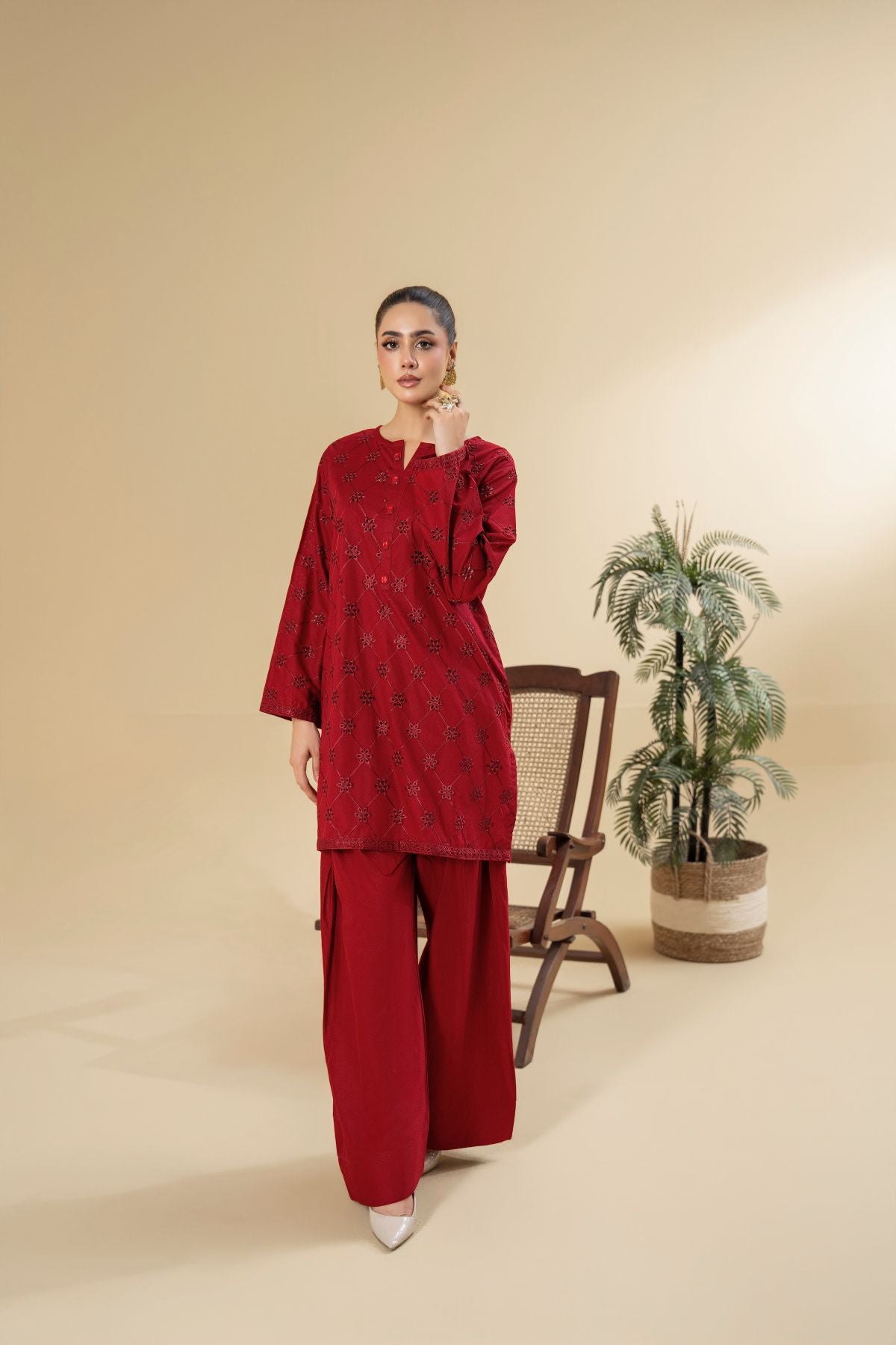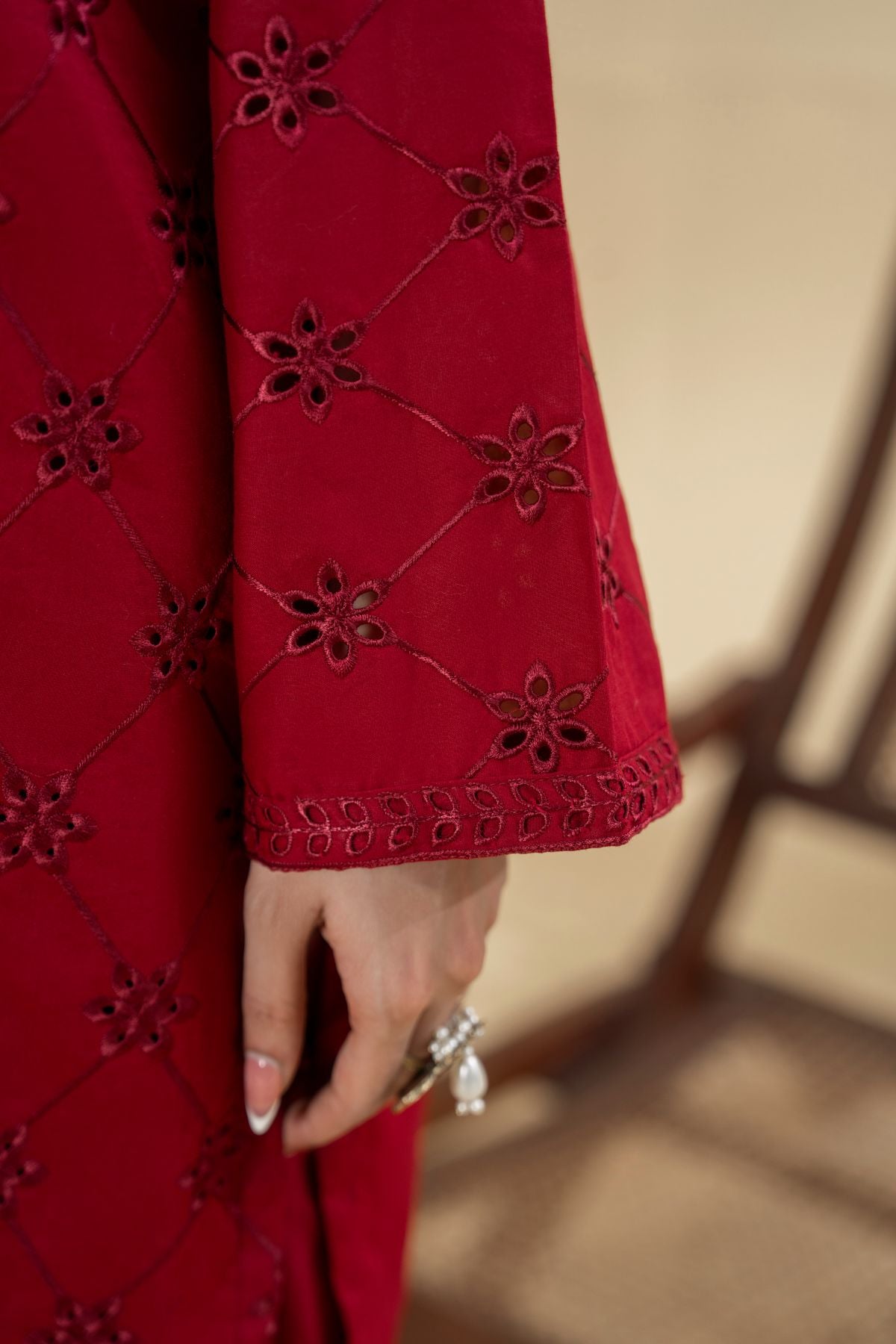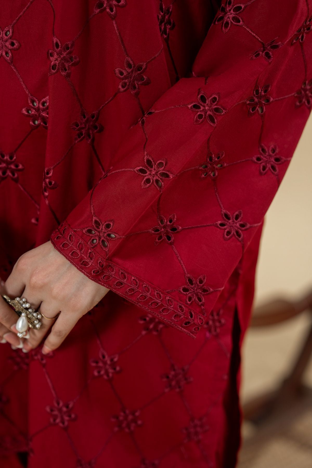 Radiate confidence and charm in Crimson Aura, a rich symphony of deep red hues. The shirt is adorned with subtle chickenkari, adding a touch of understated elegance. Accompanied by perfectly matched shalwar and a captivating floral printed dupatta in complementing tones. Crimson Aura is designed to make a striking statement wherever you go.