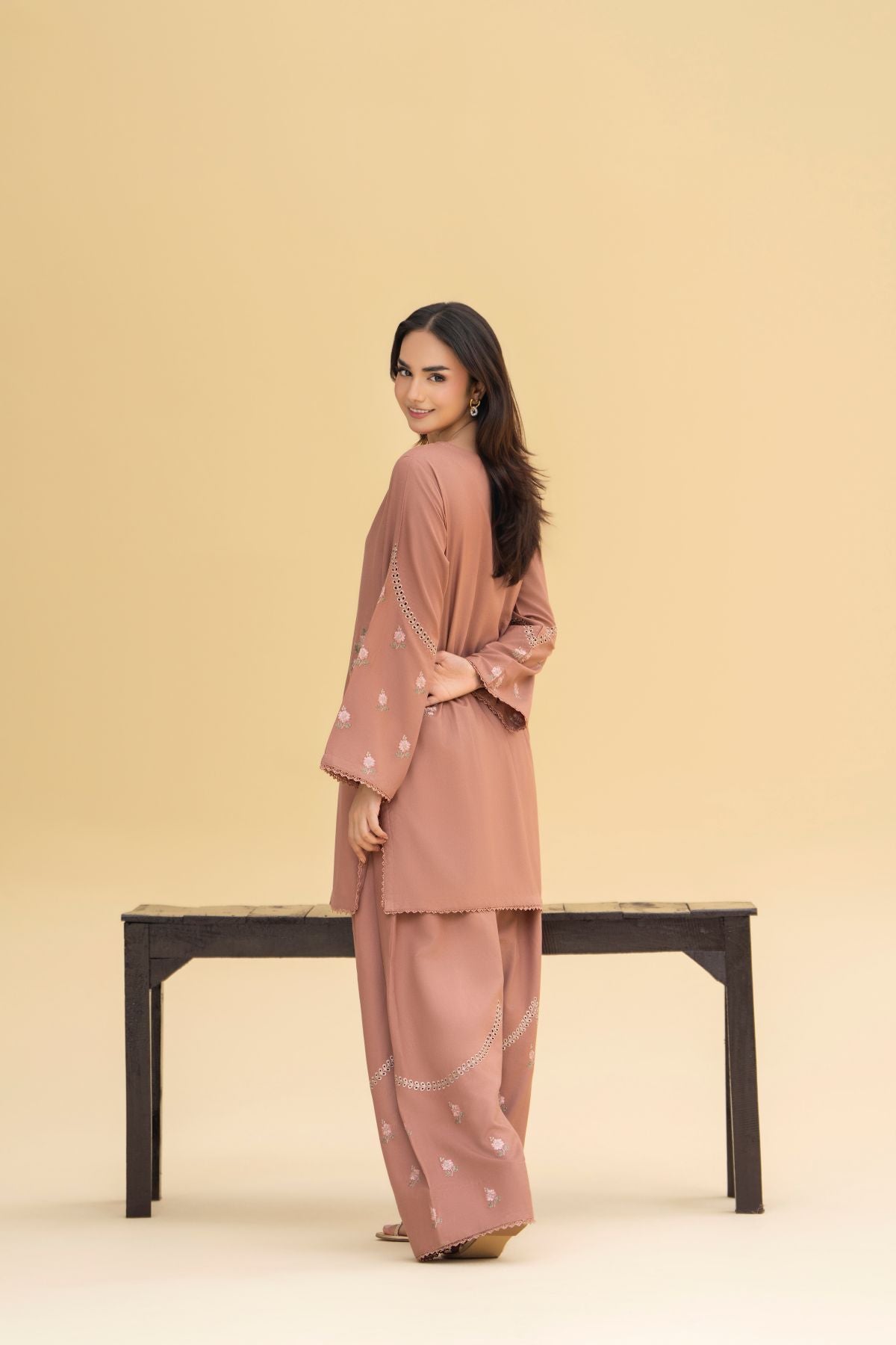 A blend of warmth and elegance. This peach-hued embroidered shirt paired with a beautifully detailed farshi shalwar creates a timeless and feminine look. The intricate embroidery adds a touch of sophistication, making it perfect for festive and winter occasions. Soft, graceful, and effortlessly stylish, a true reflection of understated luxury.