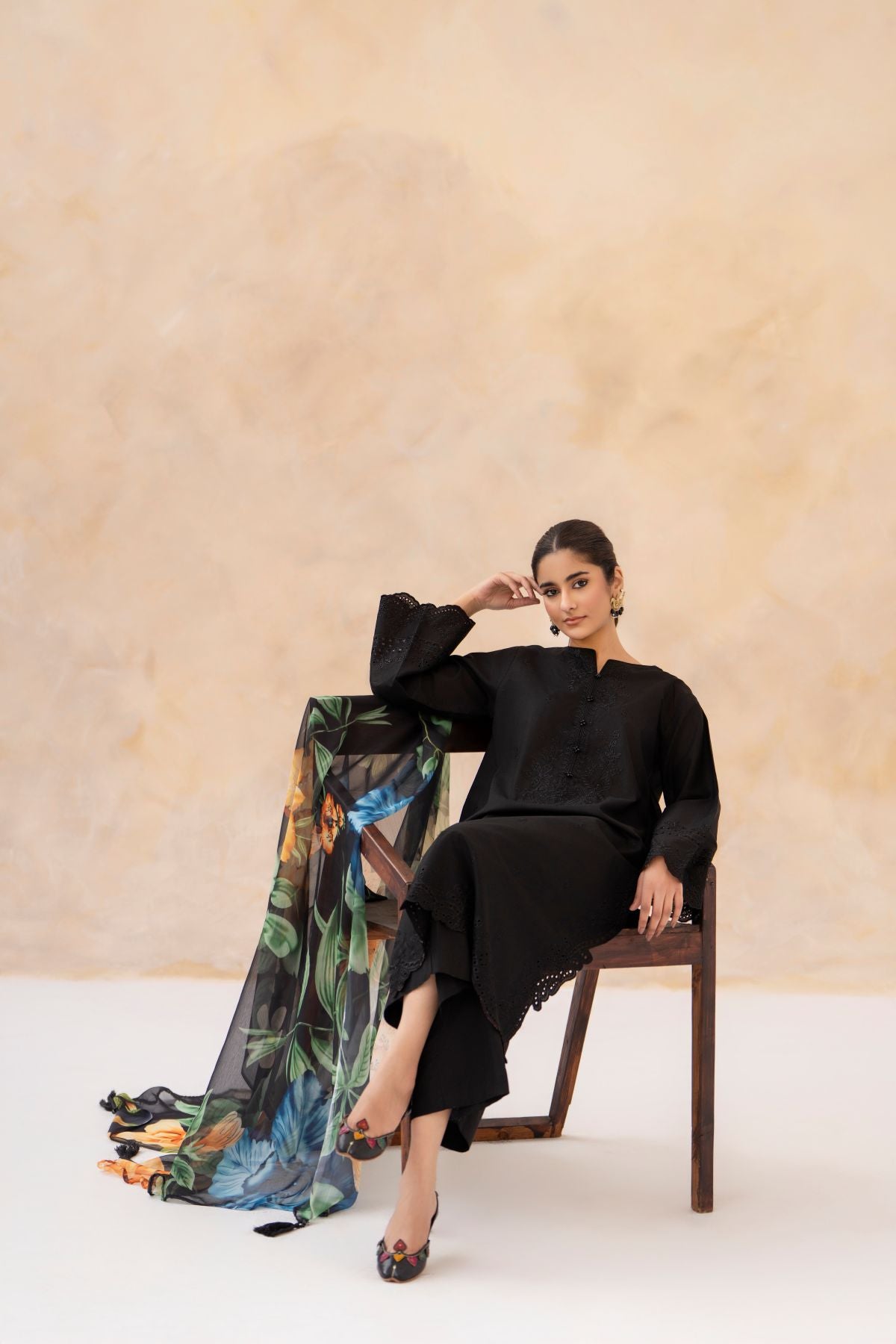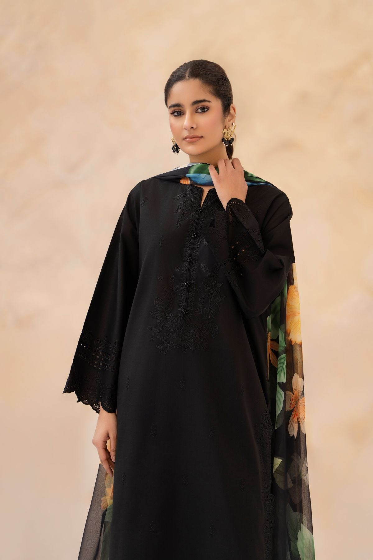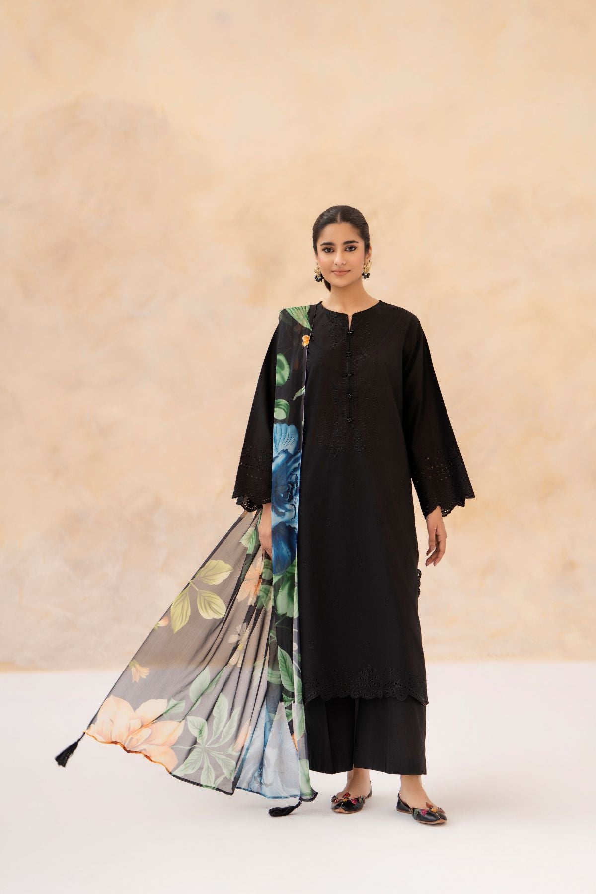Experience timeless elegance with this Black Chikankari 3-Piece Set, featuring a delicately embroidered shirt in intricate chikankari patterns. Paired with matching trousers, it offers a comfortable and graceful silhouette. The floral printed dupatta adds a refreshing pop of color and contemporary charm. Perfect for Eid and Ramadan celebrations, blending traditional craftsmanship with modern festive style.