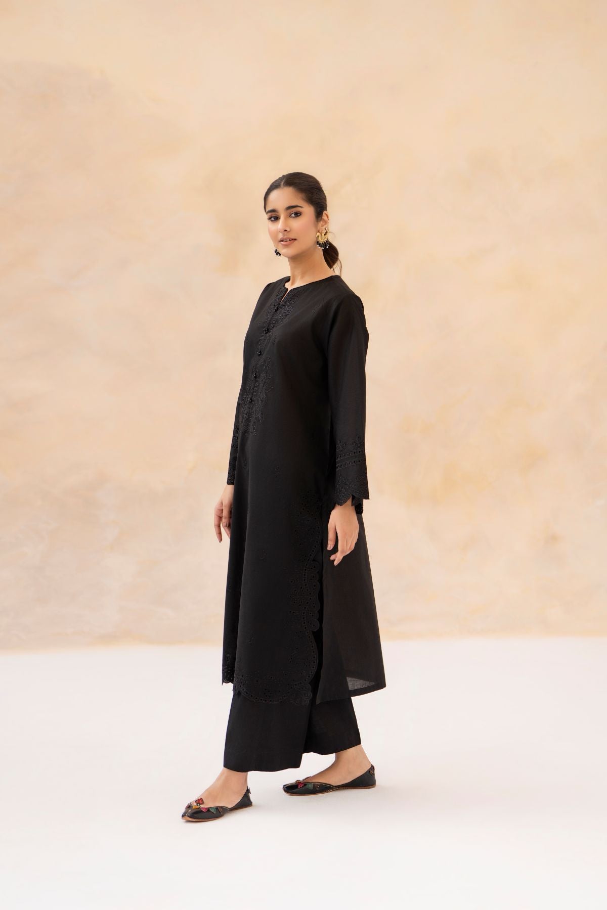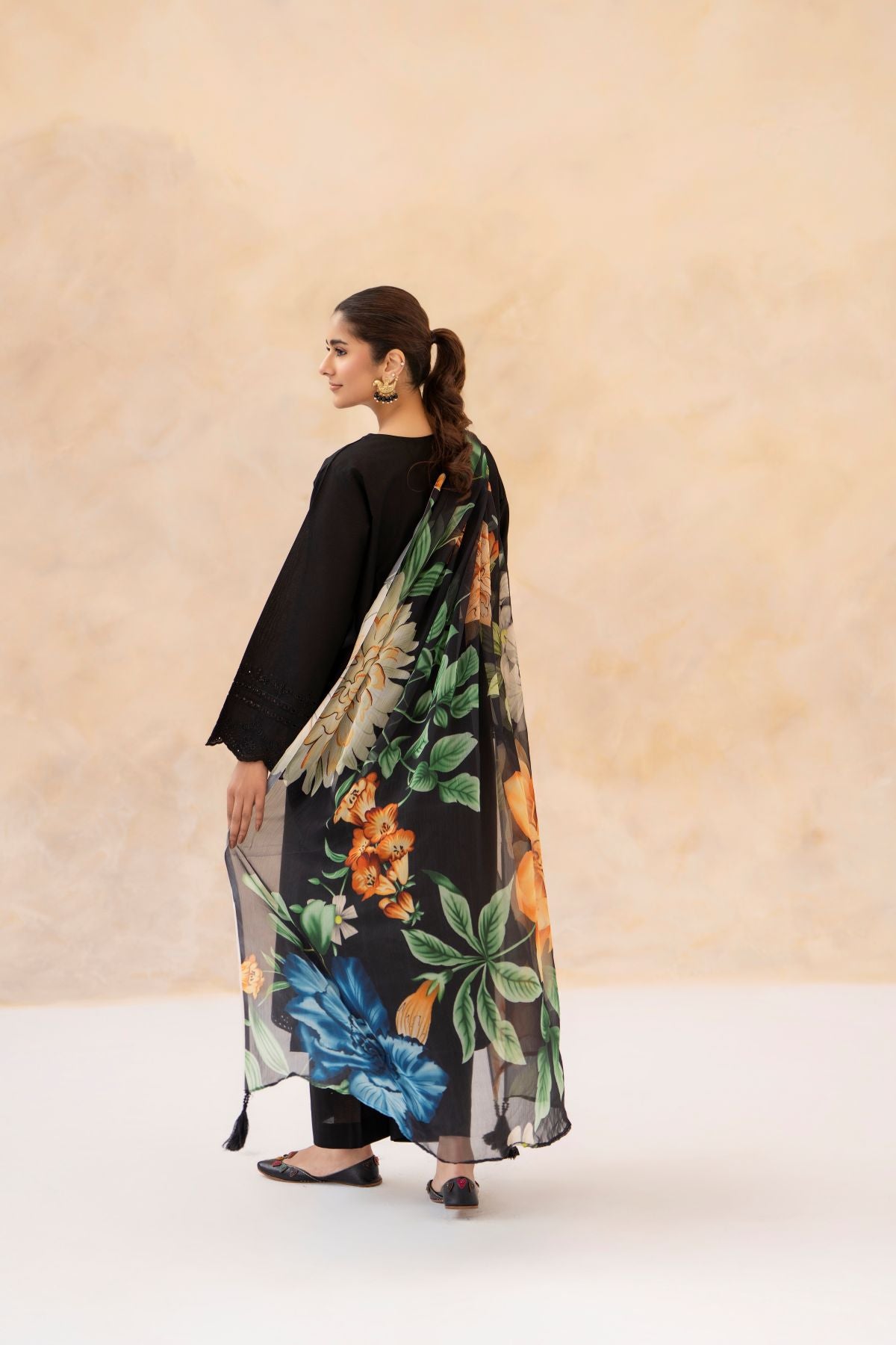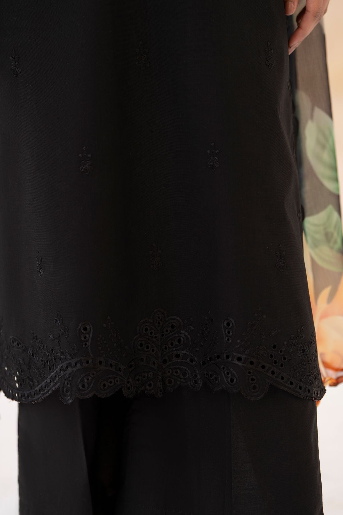 Experience timeless elegance with this Black Chikankari 3-Piece Set, featuring a delicately embroidered shirt in intricate chikankari patterns. Paired with matching trousers, it offers a comfortable and graceful silhouette. The floral printed dupatta adds a refreshing pop of color and contemporary charm. Perfect for Eid and Ramadan celebrations, blending traditional craftsmanship with modern festive style.