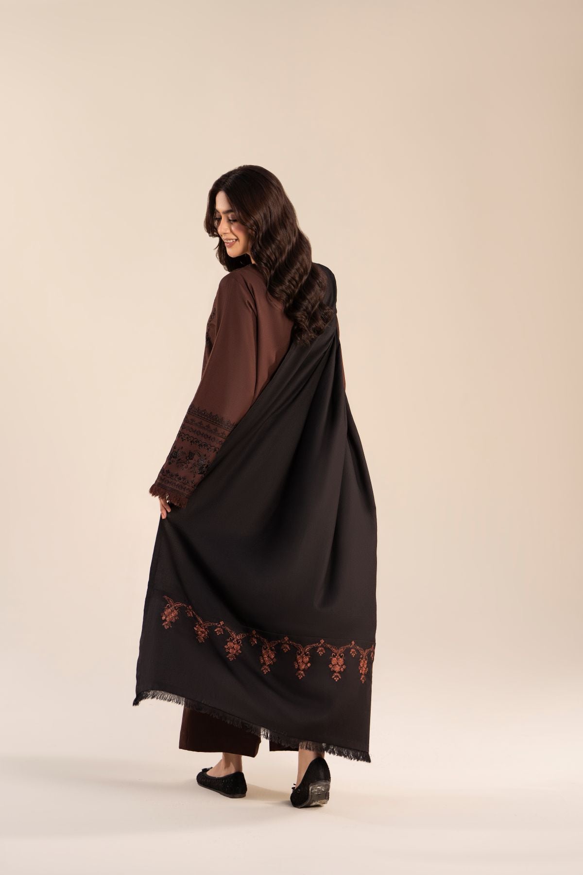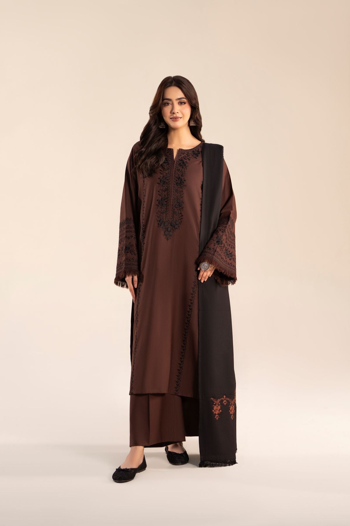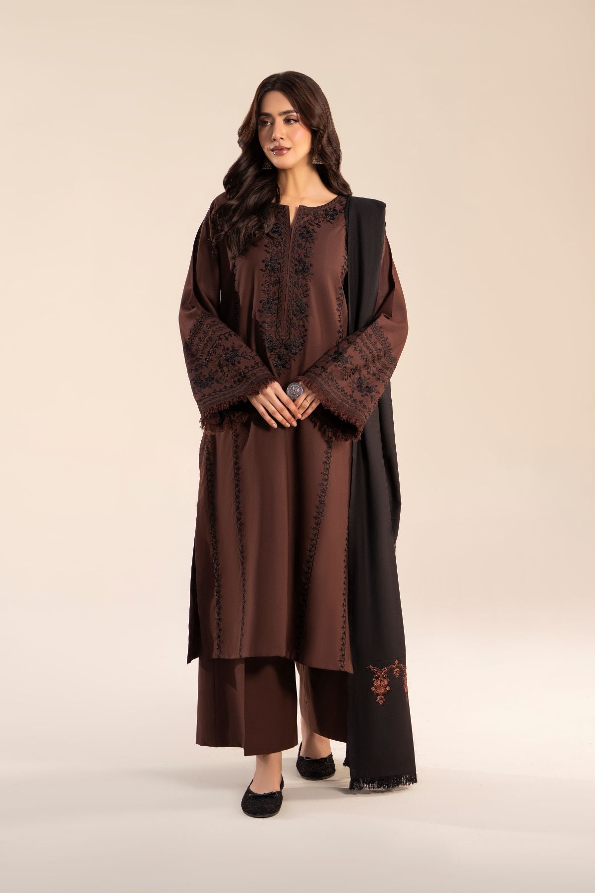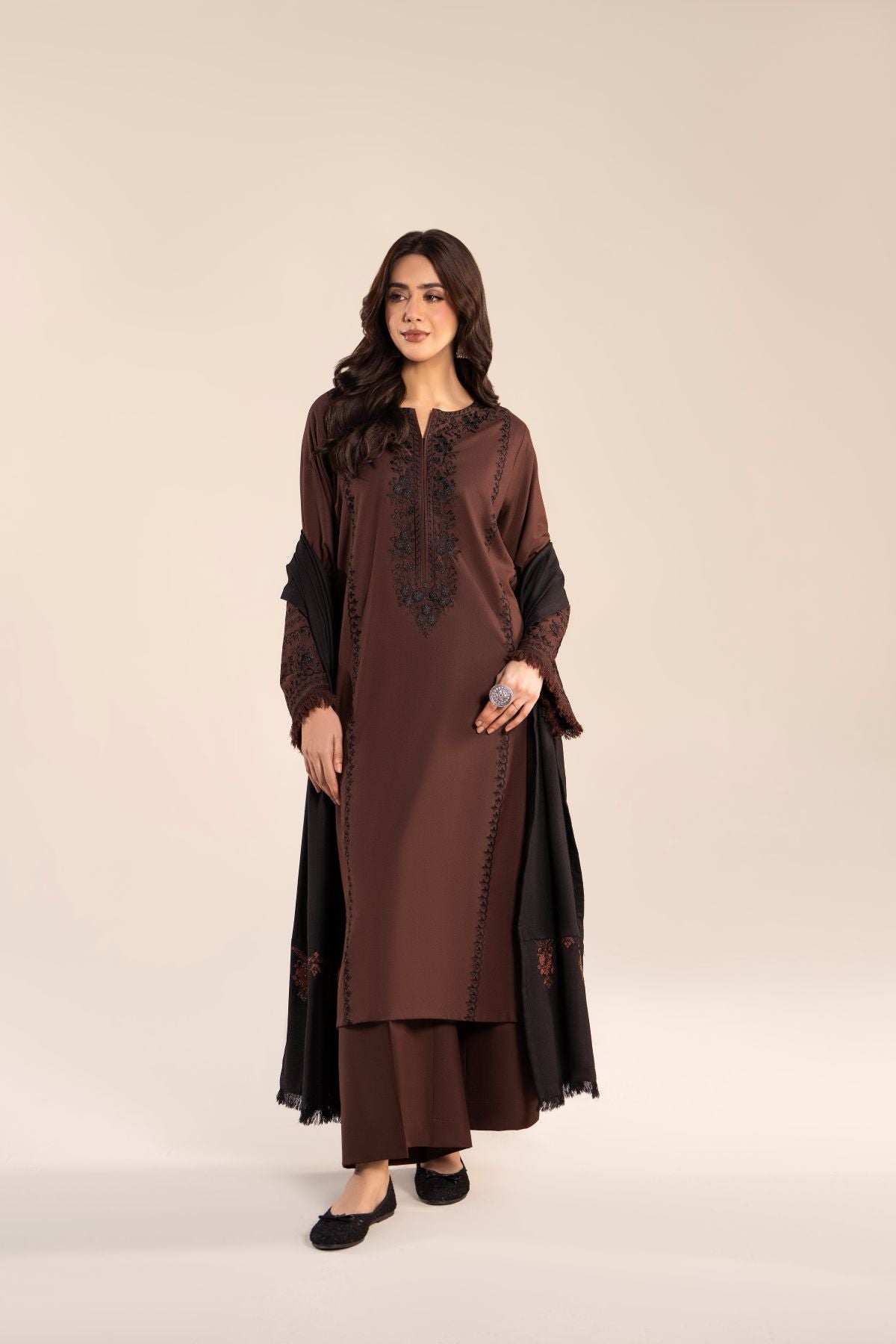 Step out in style with this elegant black and coffee brown ensemble, featuring a long shirt paired with comfortable trousers. The intricately embroidered black shawl perfectly complements the warm coffee brown tones, adding a touch of sophistication. Ideal for casual outings, this set combines contemporary elegance with timeless charm