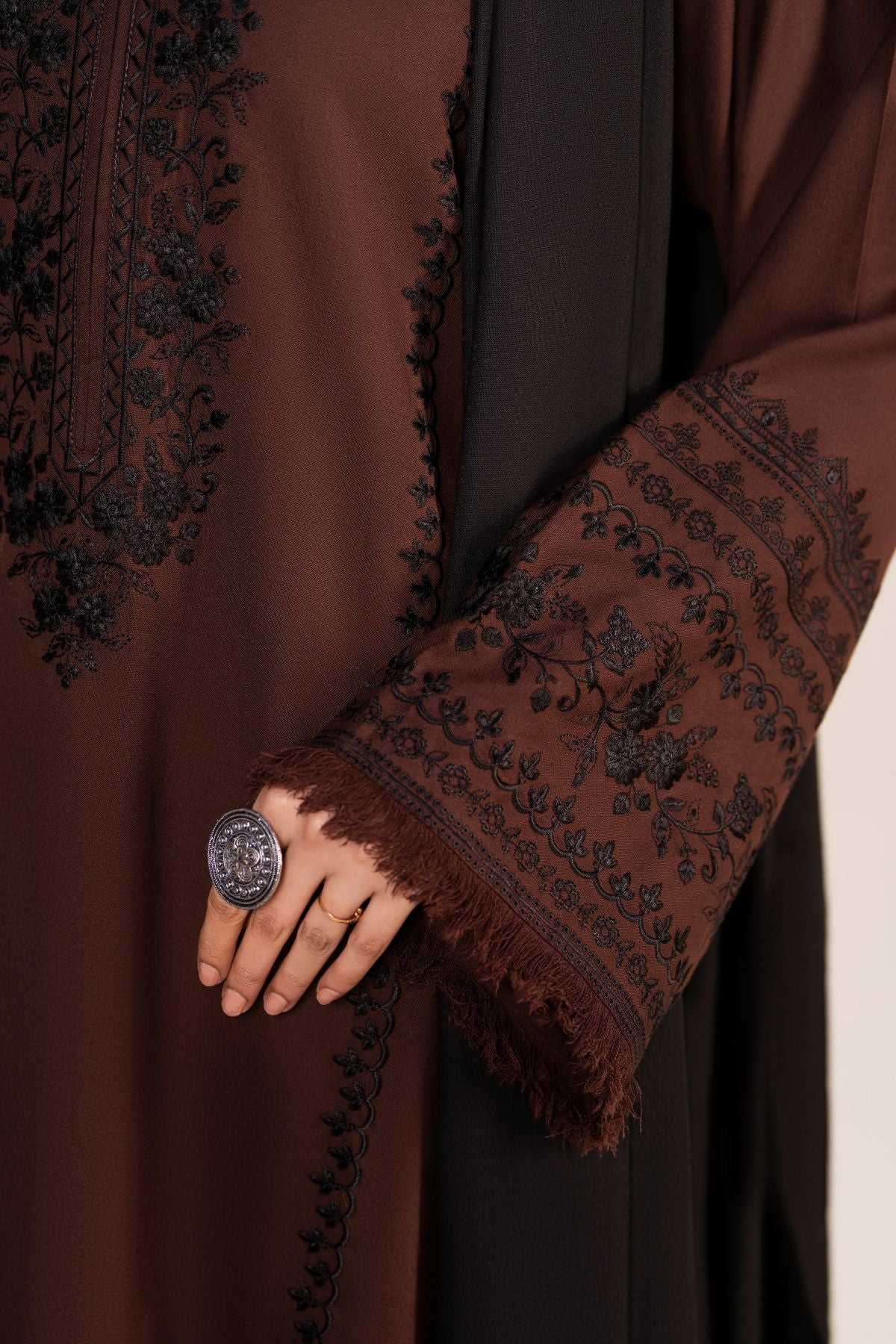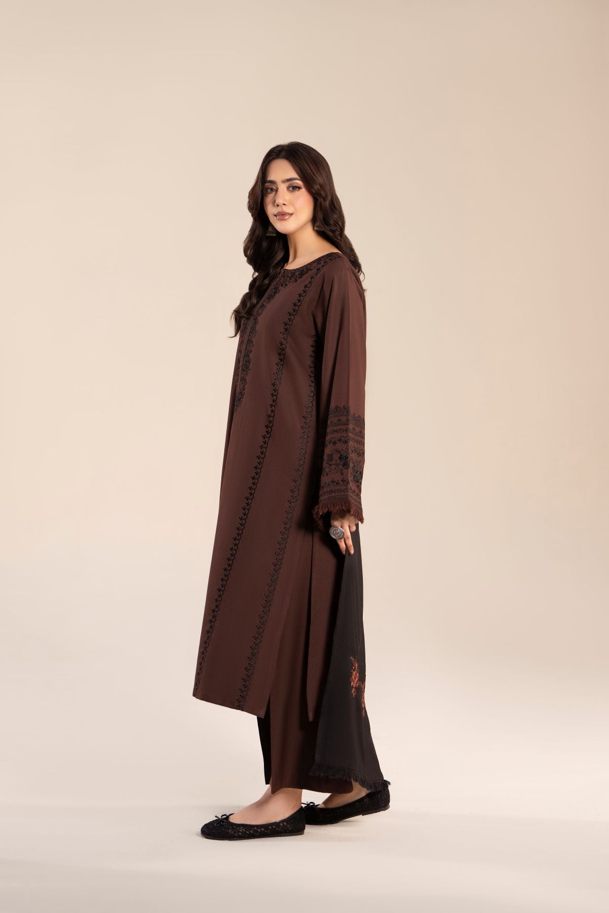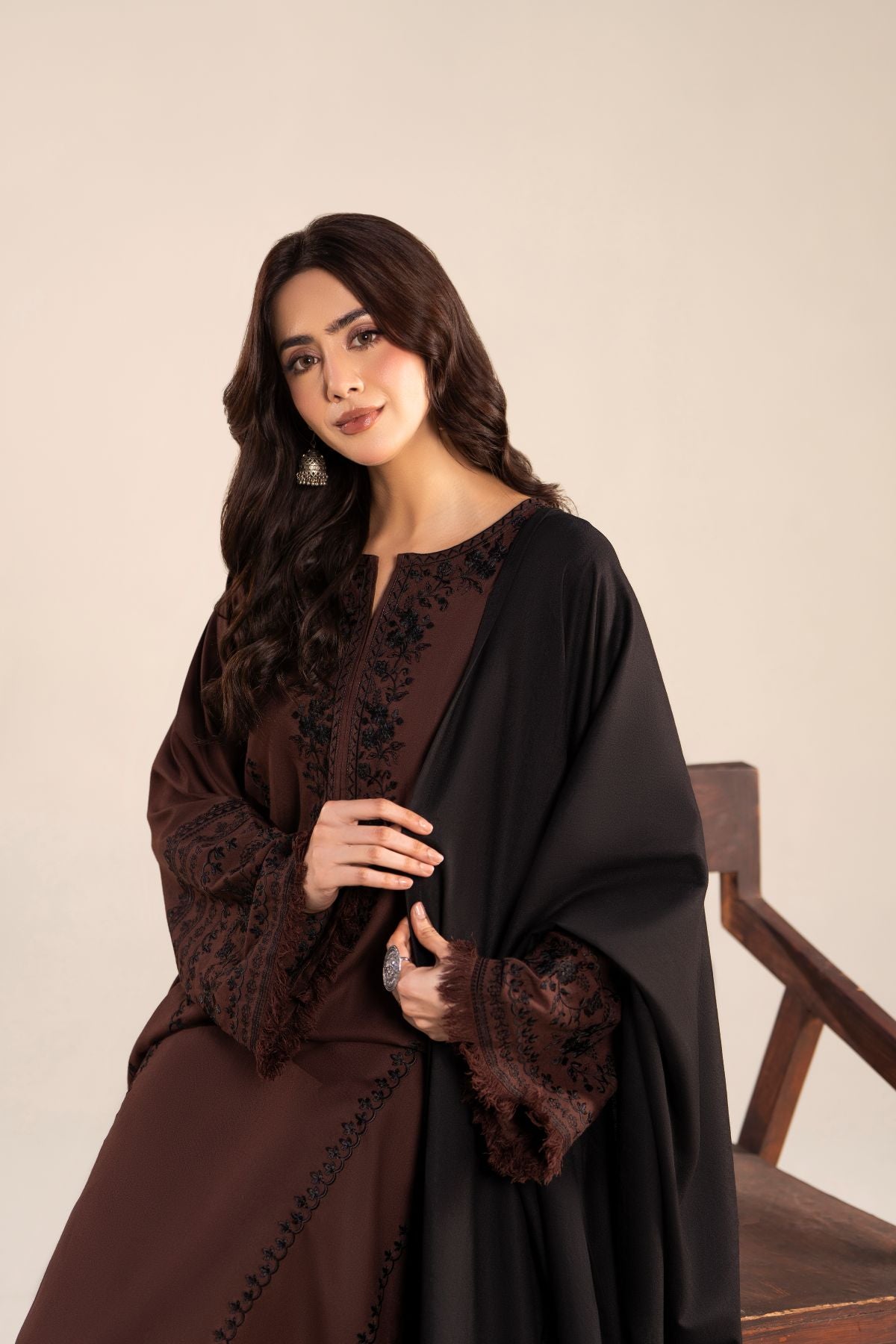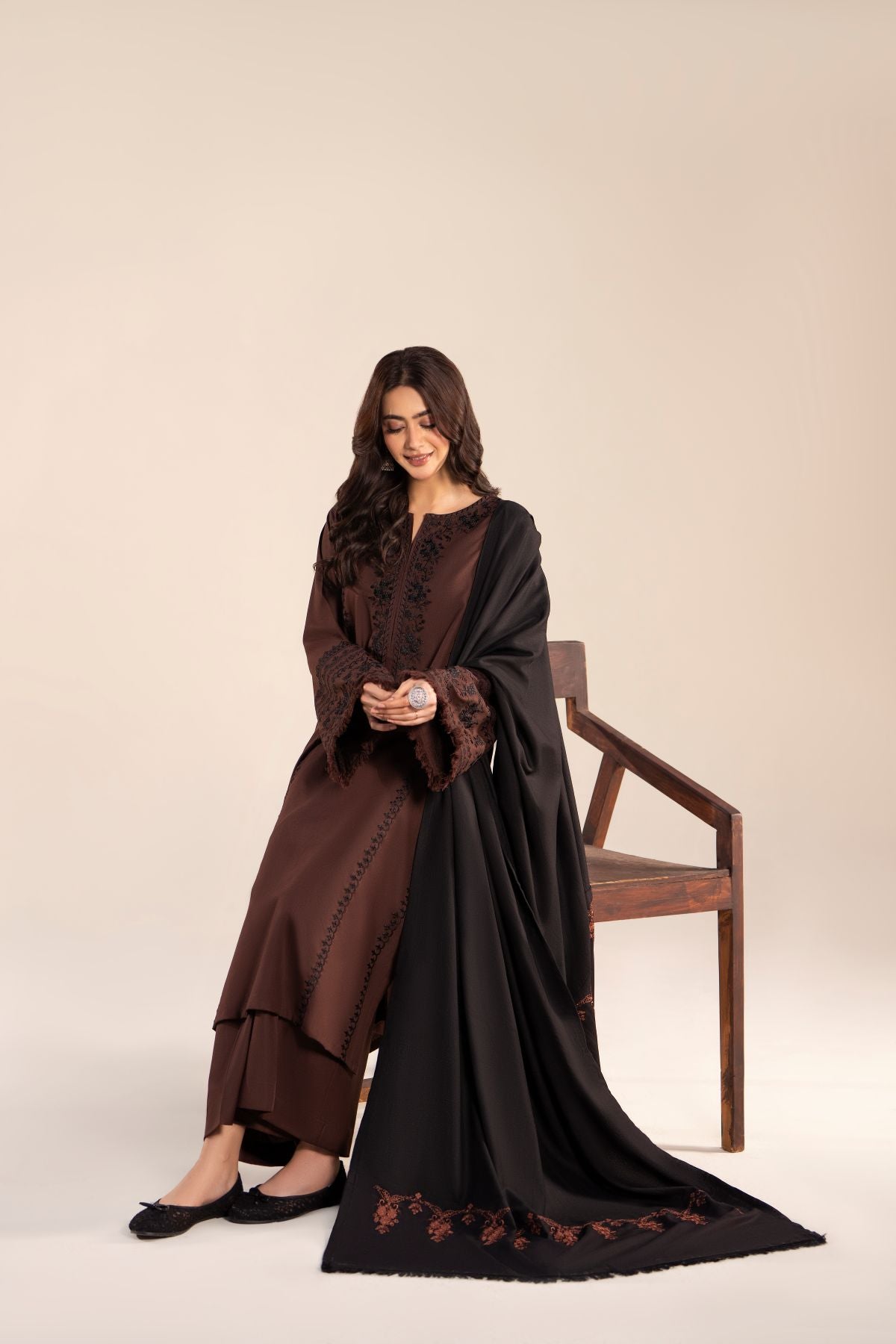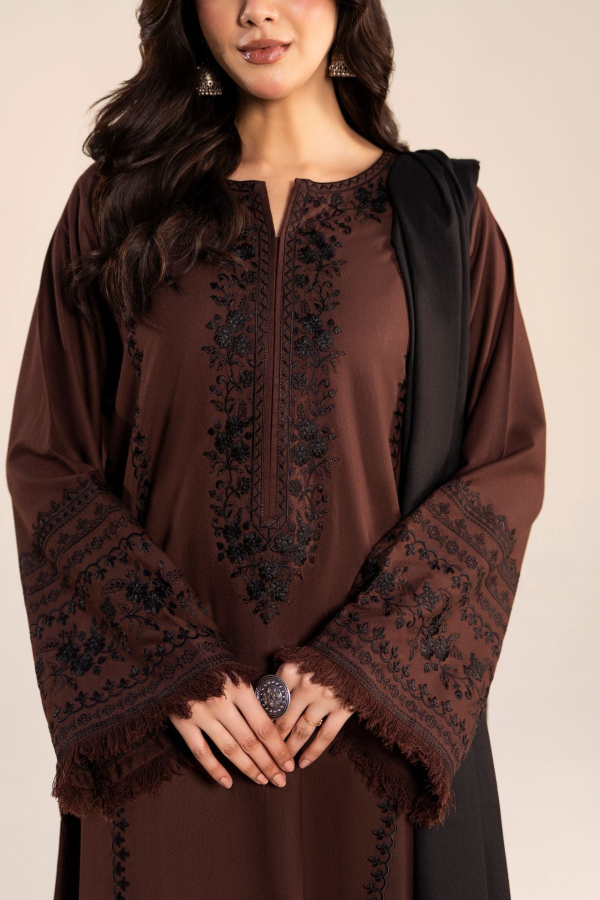 Step out in style with this elegant black and coffee brown ensemble, featuring a long shirt paired with comfortable trousers. The intricately embroidered black shawl perfectly complements the warm coffee brown tones, adding a touch of sophistication. Ideal for casual outings, this set combines contemporary elegance with timeless charm