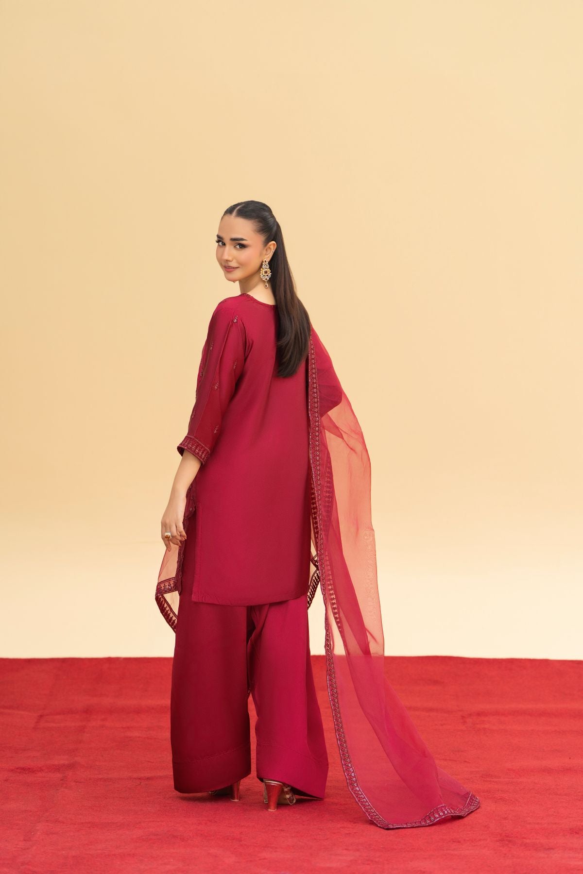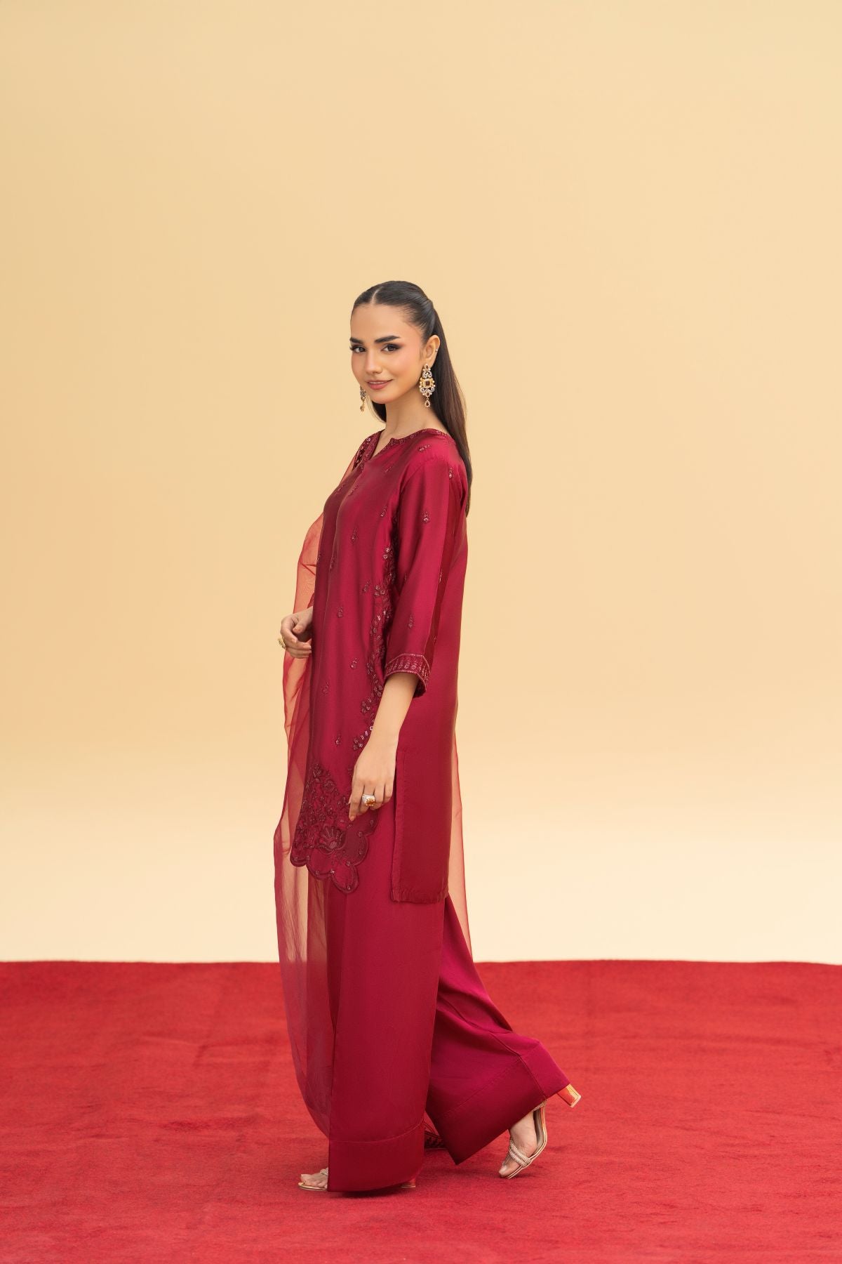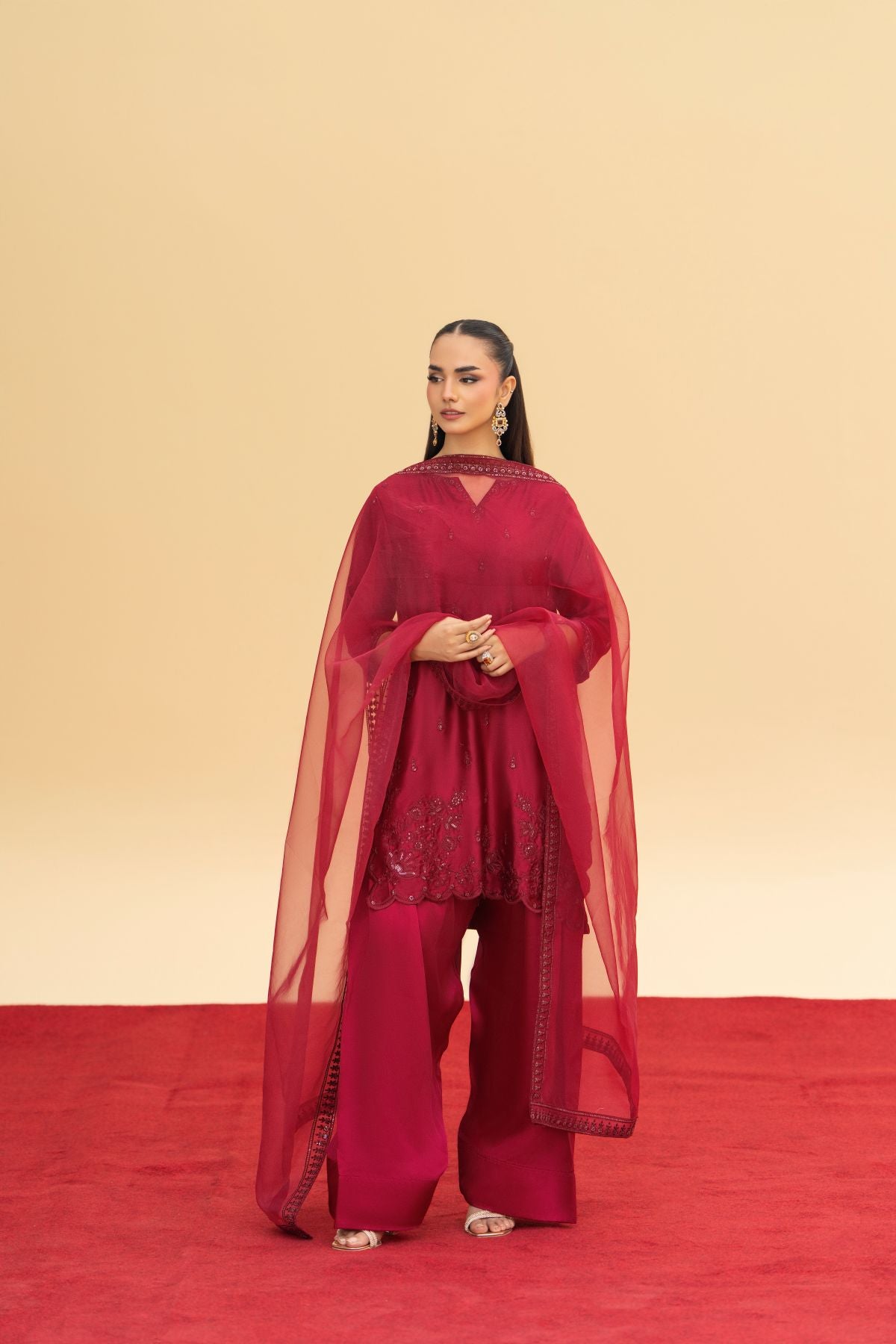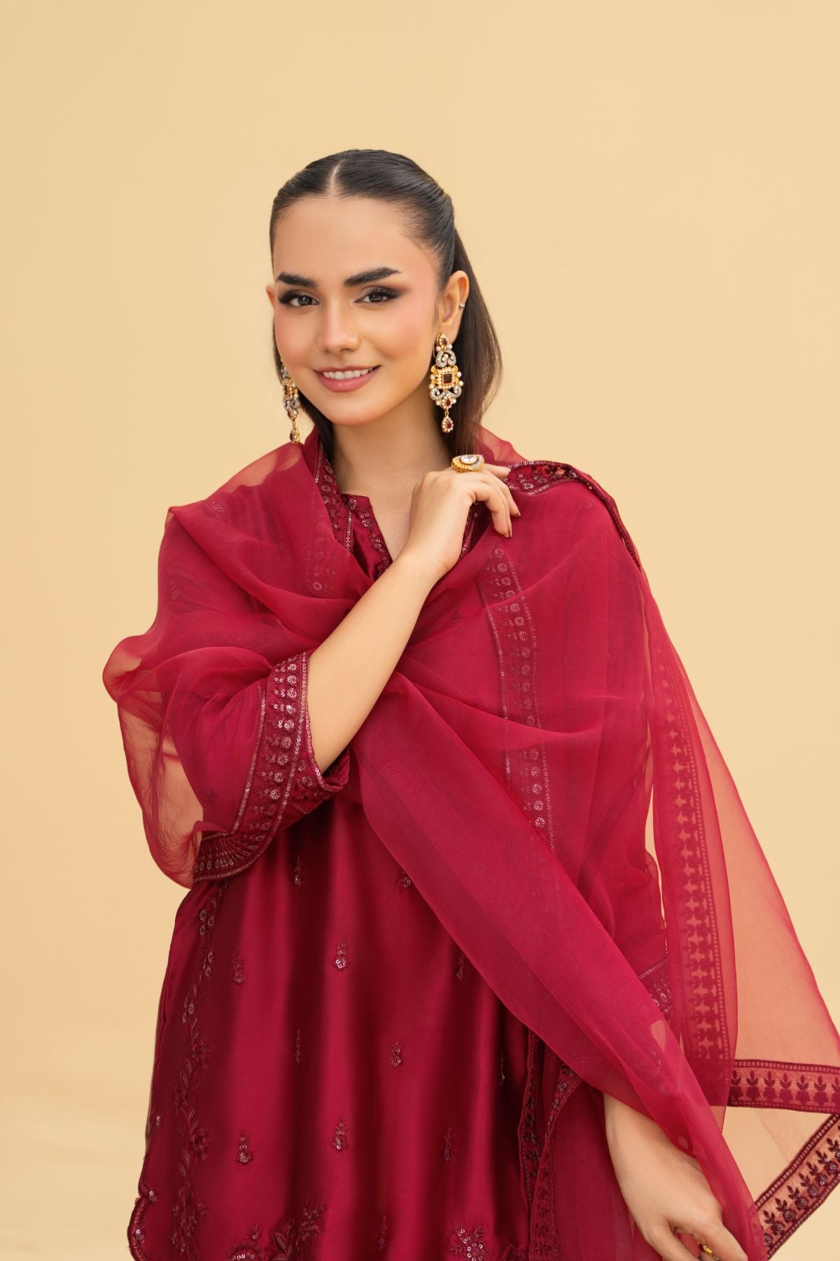 This reddish maroon silk ensemble features a beautifully embroidered short shirt paired with a classic Farshi shalwar for a regal silhouette. The embroidered organza dupatta adds a luxurious finishing touch, enhancing its festive charm. Rich, radiant, and effortlessly elegant, a perfect blend of tradition and sophistication.