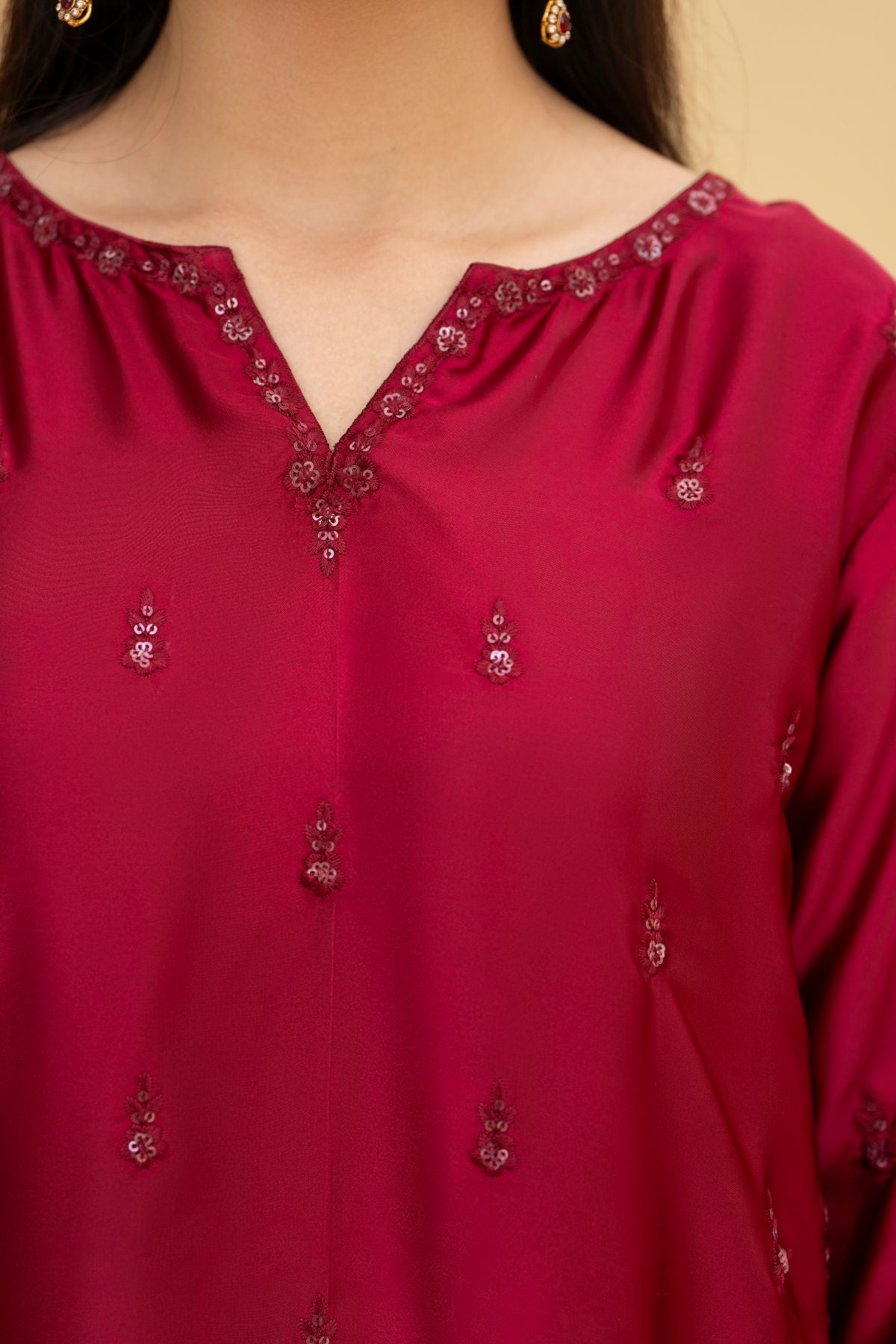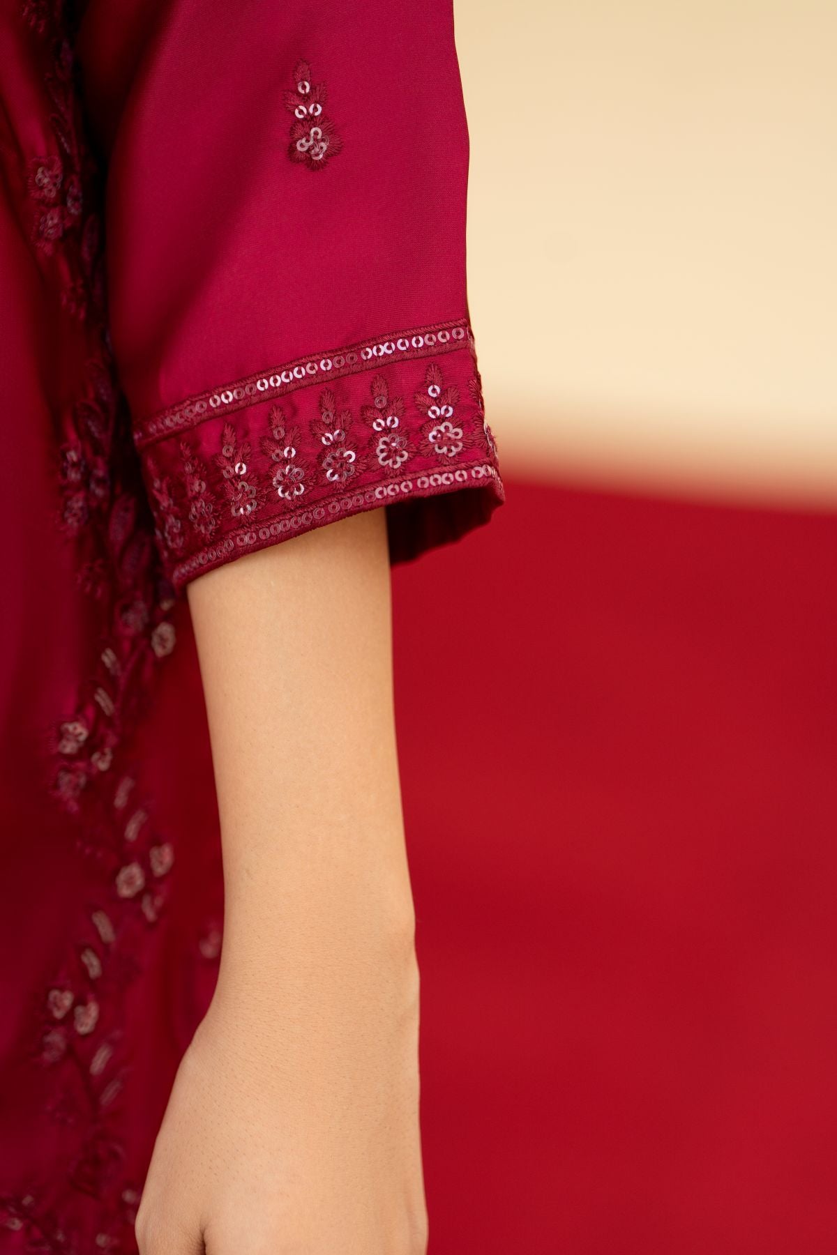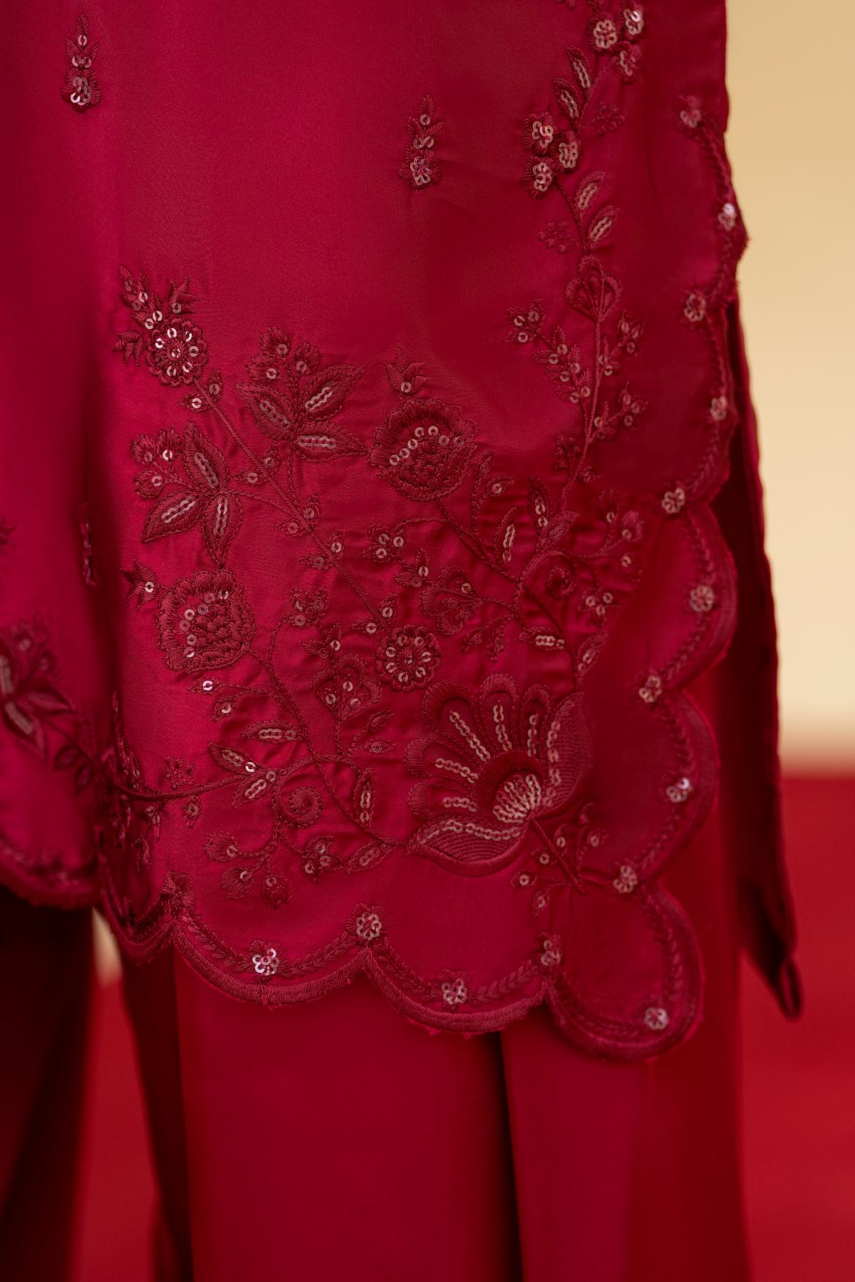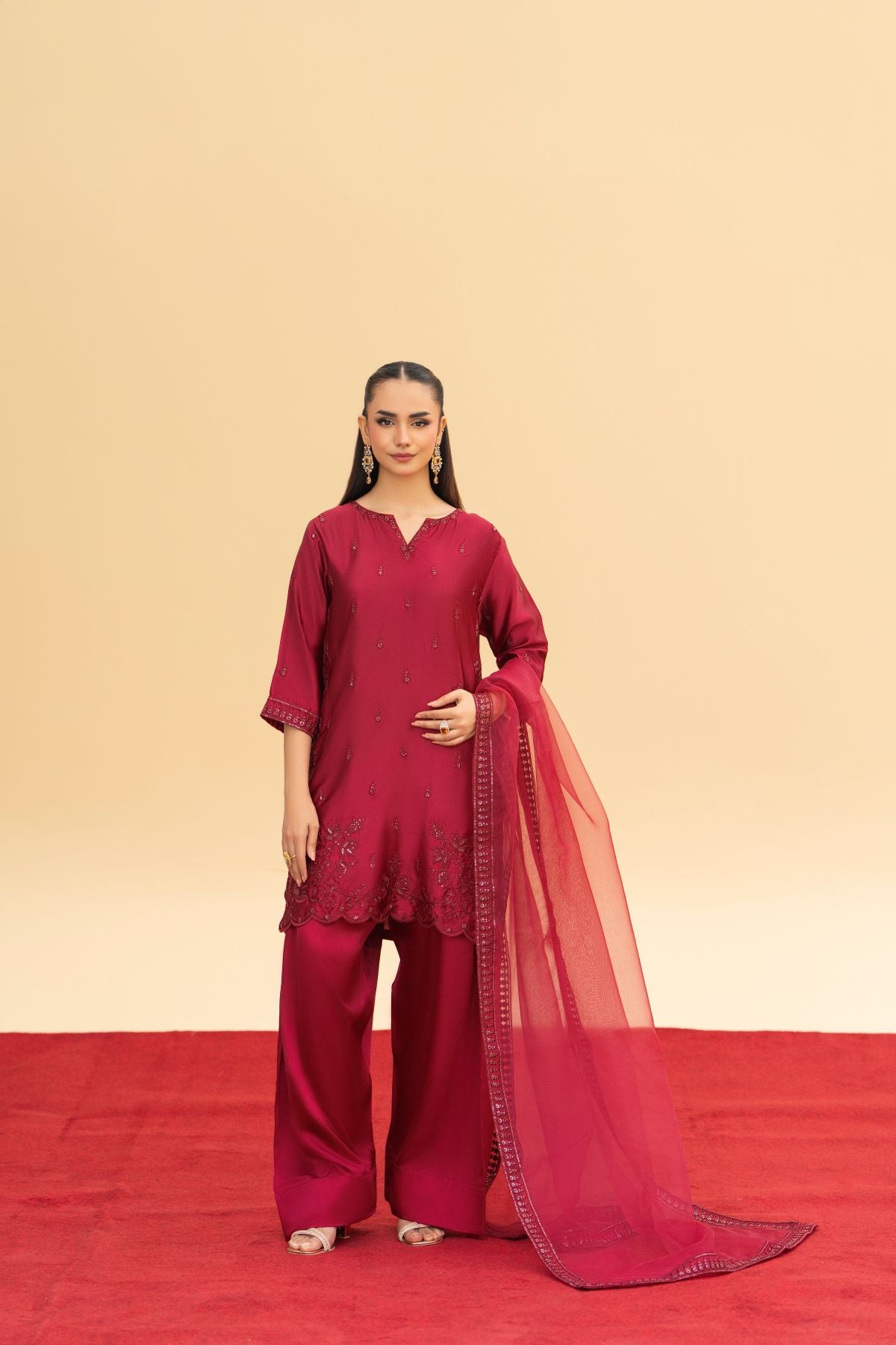 This reddish maroon silk ensemble features a beautifully embroidered short shirt paired with a classic Farshi shalwar for a regal silhouette. The embroidered organza dupatta adds a luxurious finishing touch, enhancing its festive charm. Rich, radiant, and effortlessly elegant, a perfect blend of tradition and sophistication.
