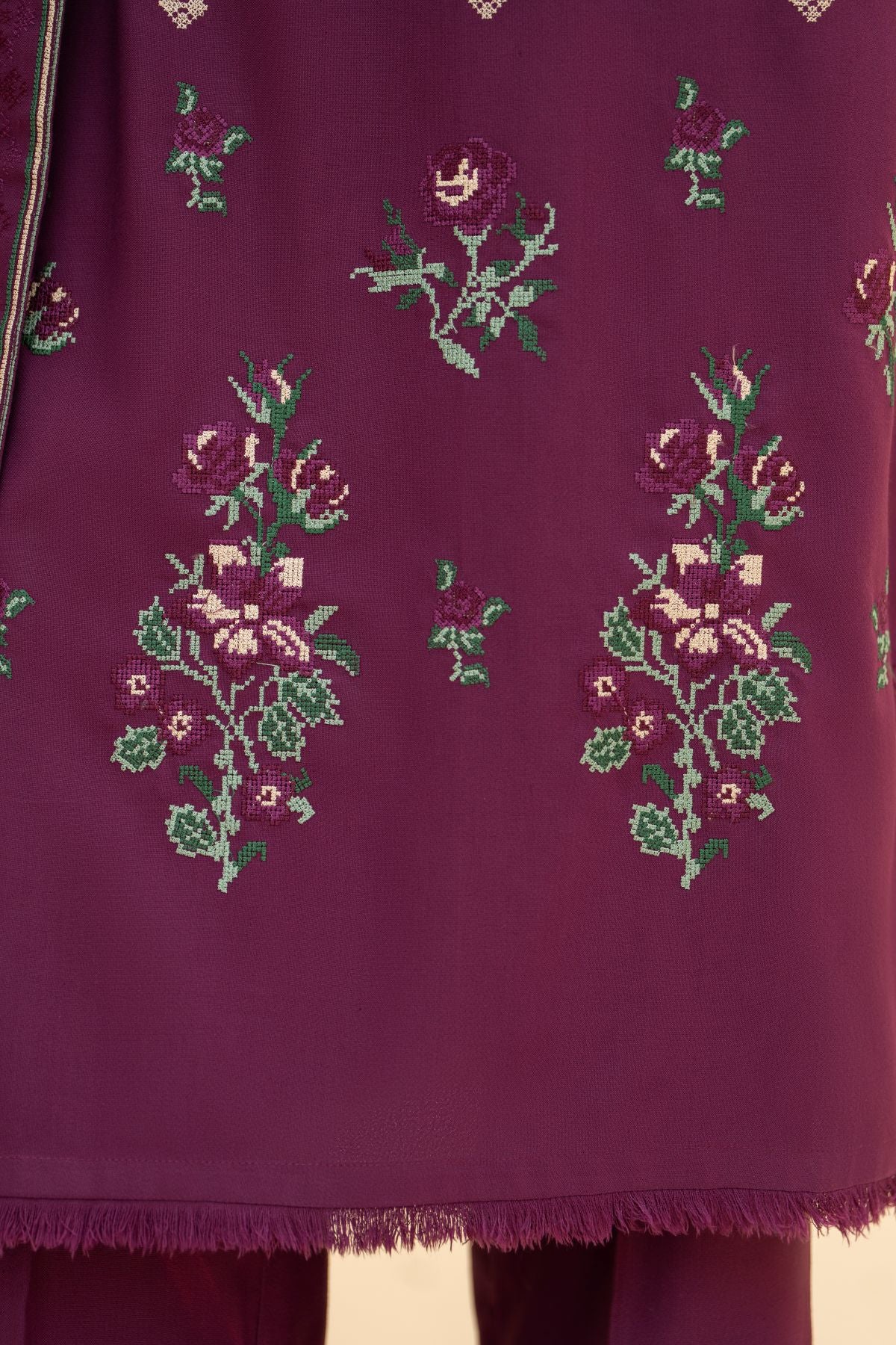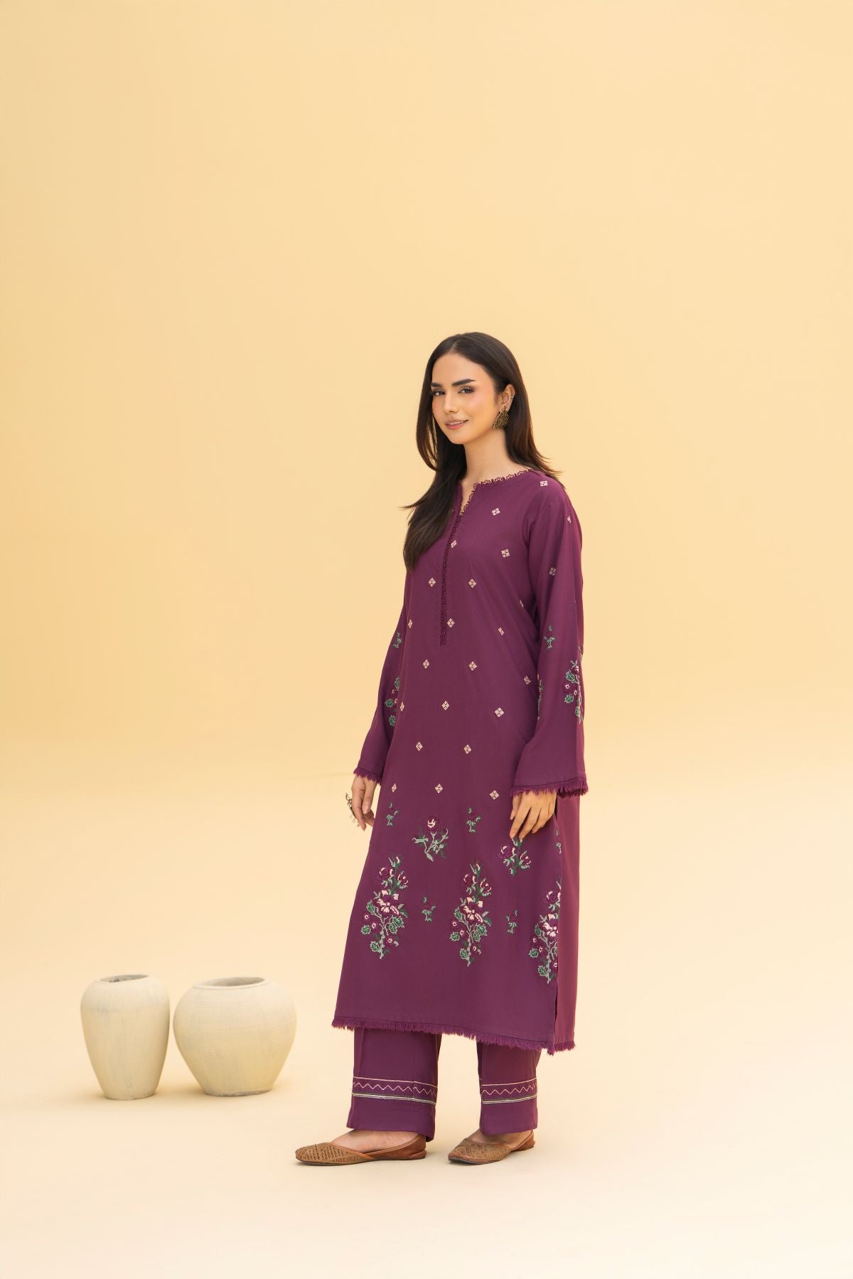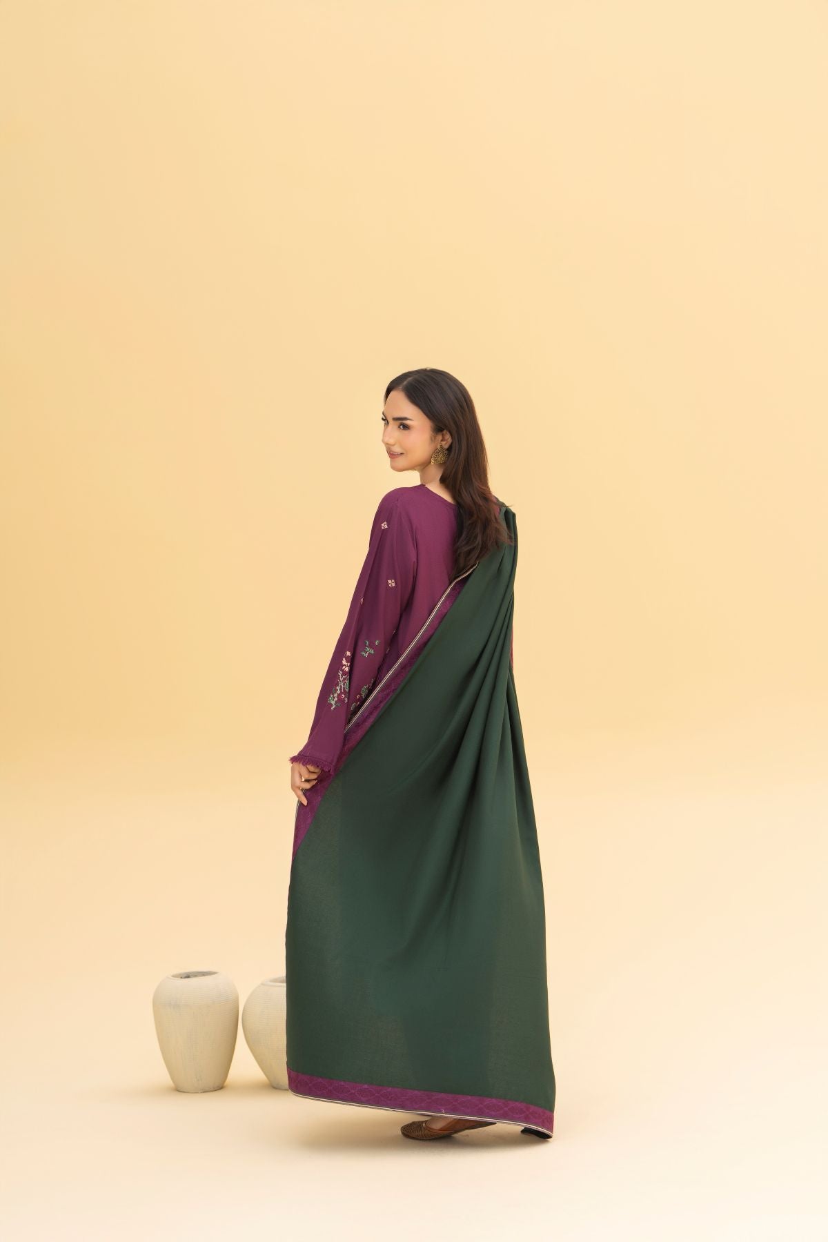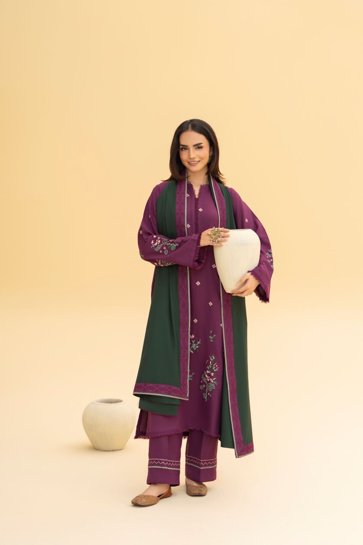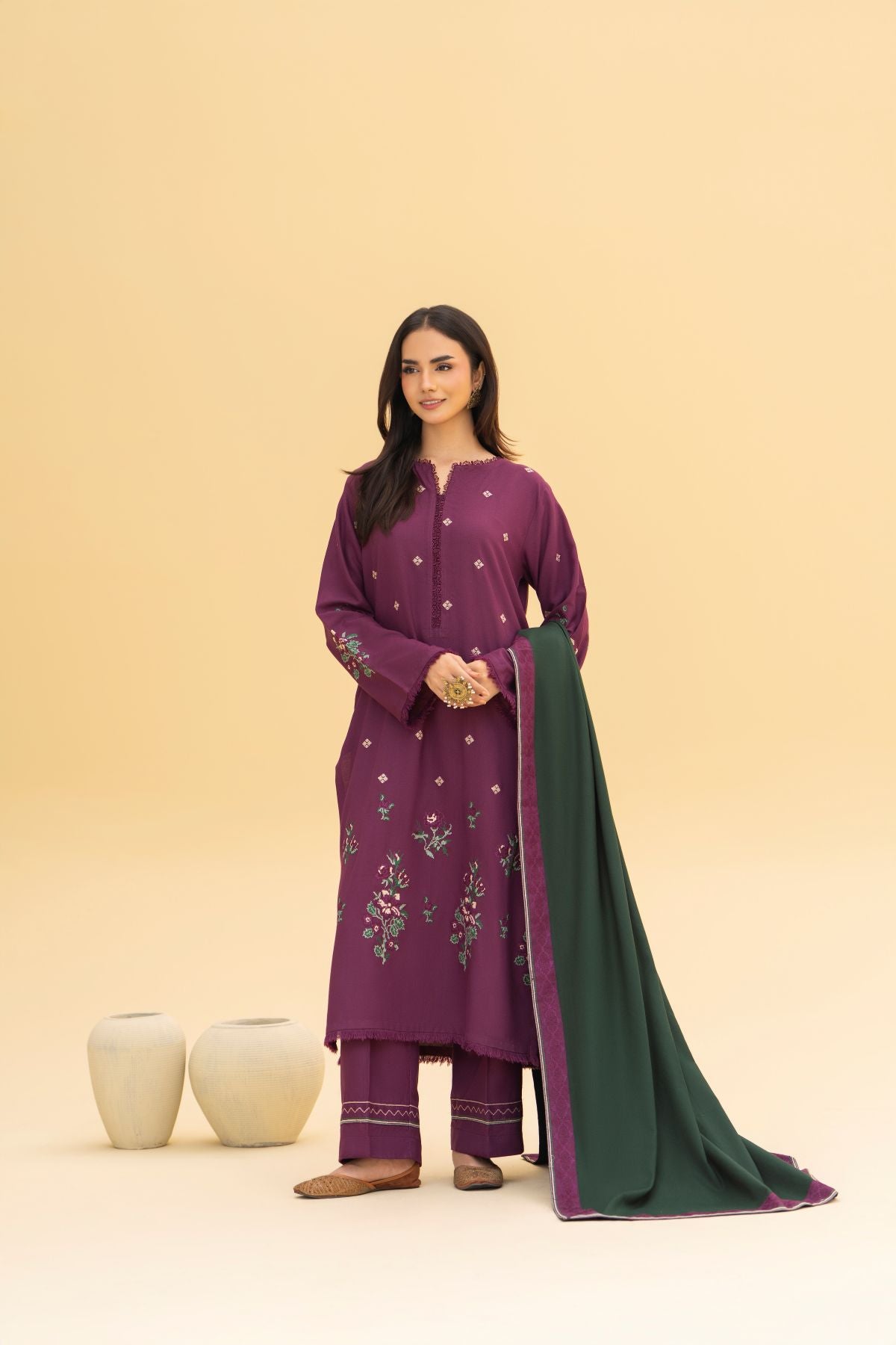 This deep purple embroidered long shirt paired with a matching embroidered straight trouser exudes regal sophistication. The contrasting moongia green printed shawl adds a refreshing pop of color, creating a striking balance between boldness and grace. Ideal for winter soirées and festive occasions, this ensemble captures timeless charm with a modern edge.