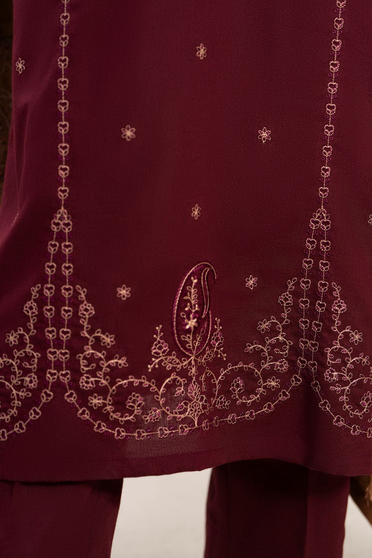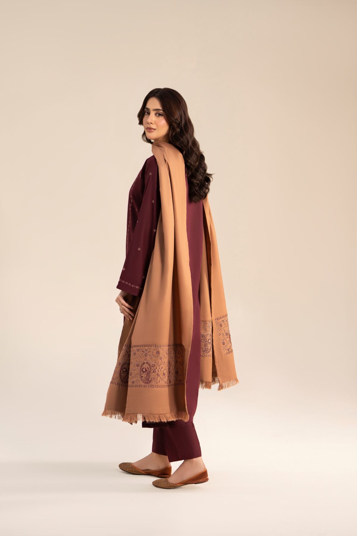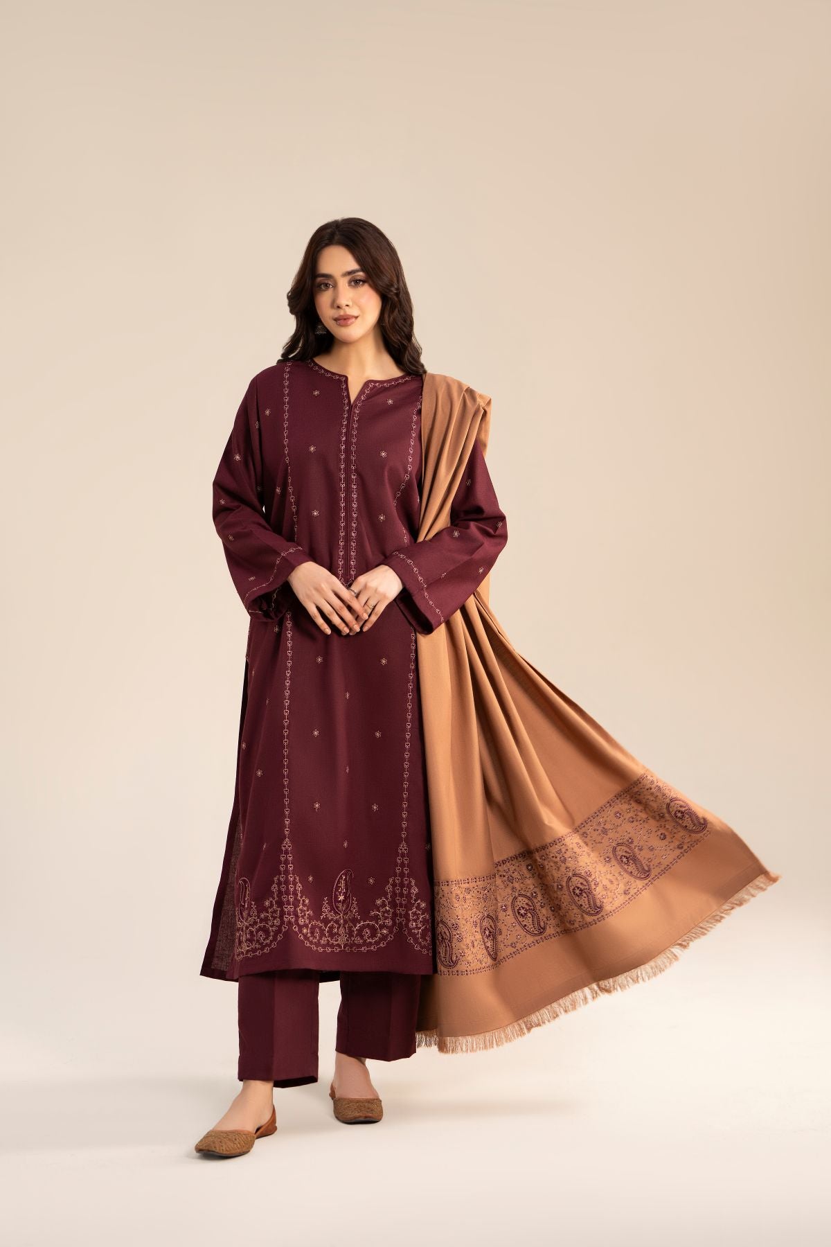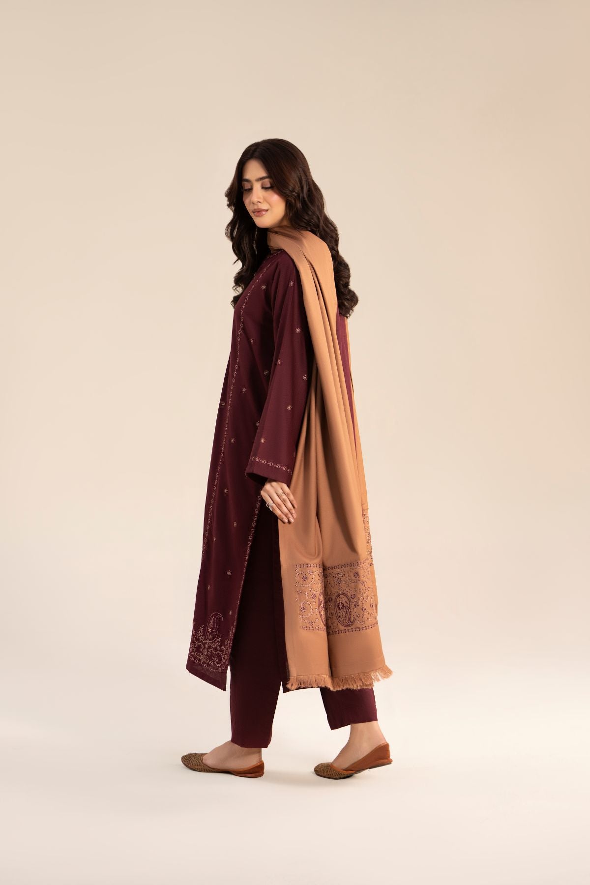 Elevate your wardrobe with this elegant stitched 3-piece set in rich burgundy, featuring a long shirt with intricate embroidery. Paired with straight trousers, it offers a comfortable yet stylish silhouette for everyday or festive wear. The smoky brown embroidered shawl adds a graceful contrast, completing the ensemble with sophistication.