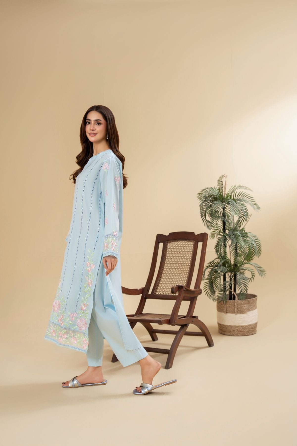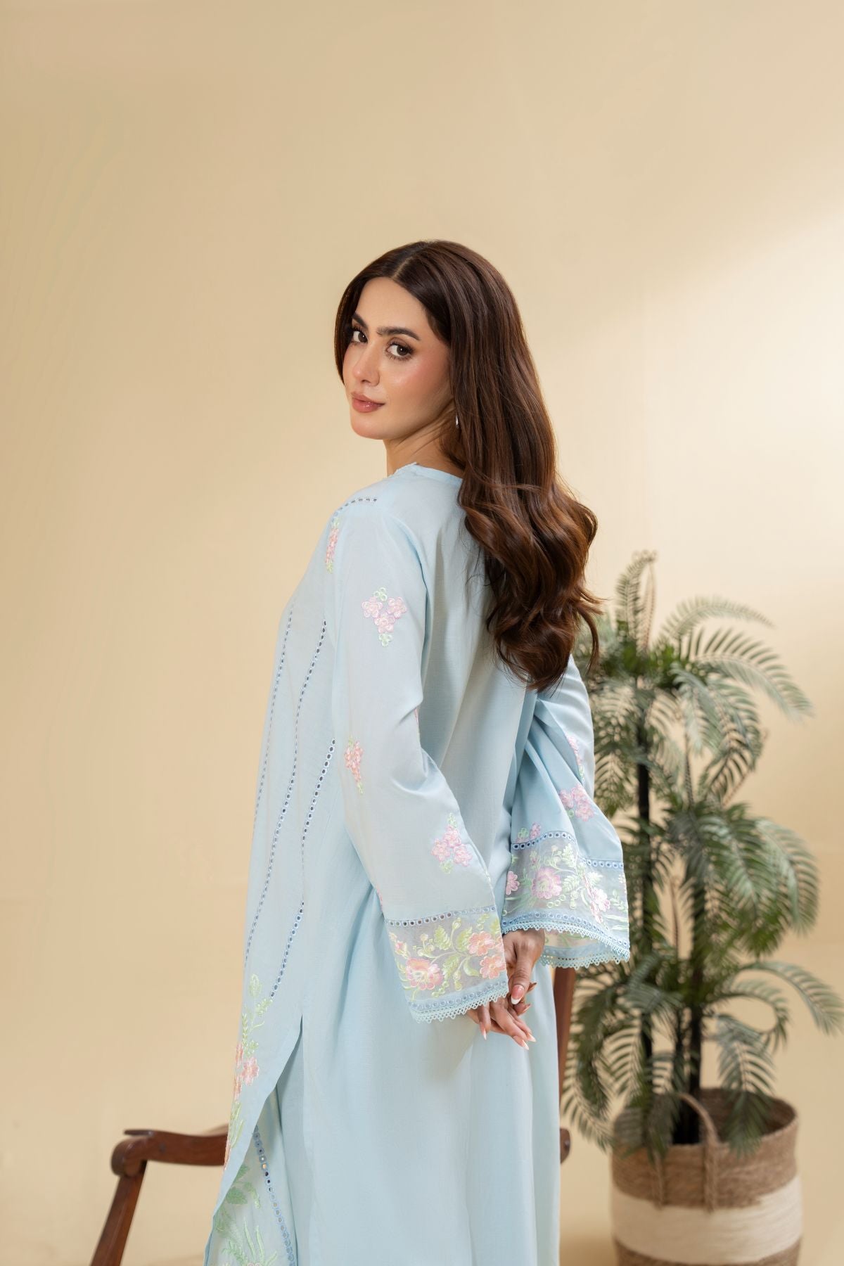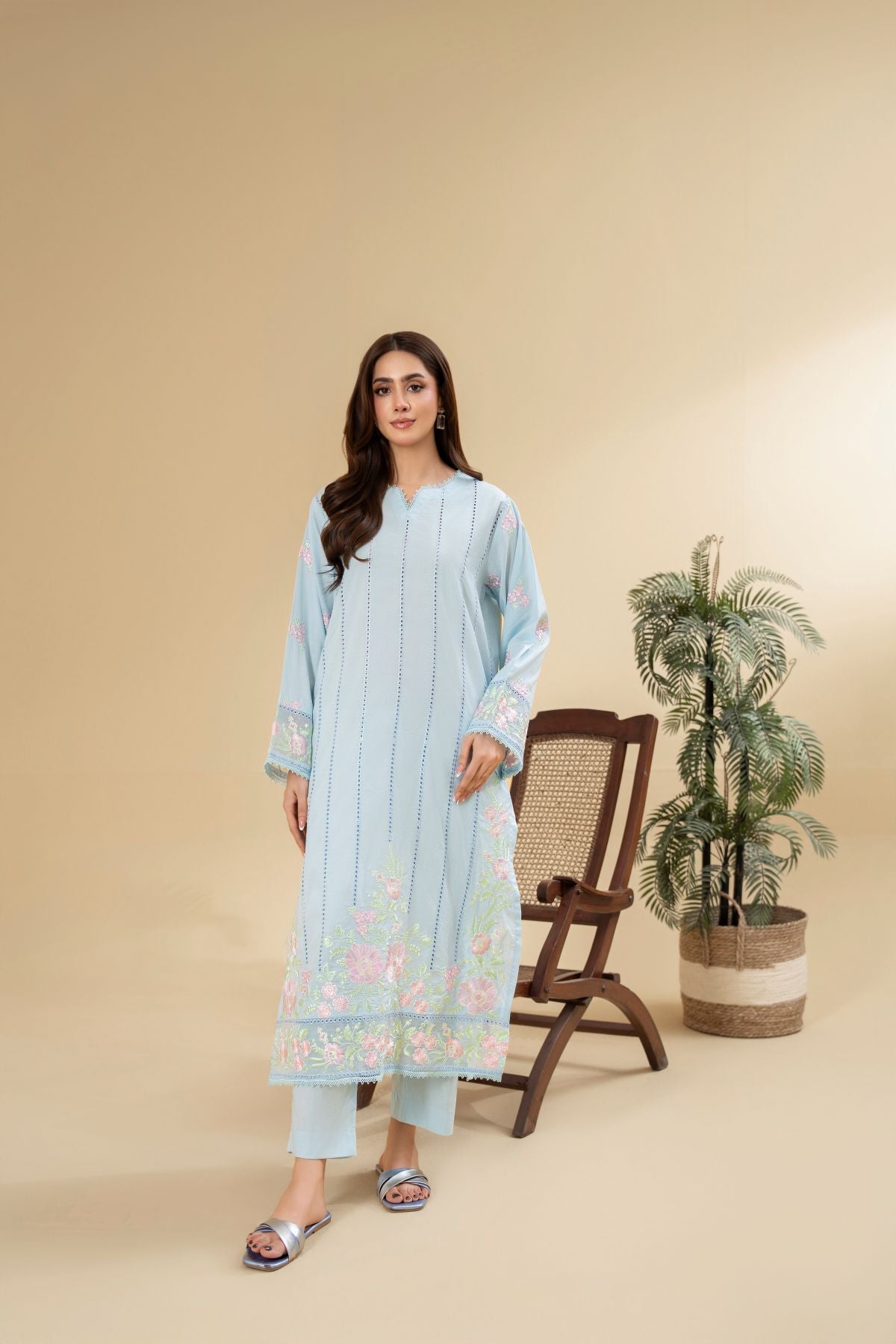 Drift into serene elegance with Skyline Gleam, a captivating ensemble in a refreshing sky blue hue. The kameez is beautifully adorned with delicate floral embroidery in soft pinks and greens, creating a graceful vertical design that flows to the hem and sleeves. Paired with coordinating pants, Skyline Gleam offers a soothing yet sophisticated aesthetic, perfect for a refined daytime look.