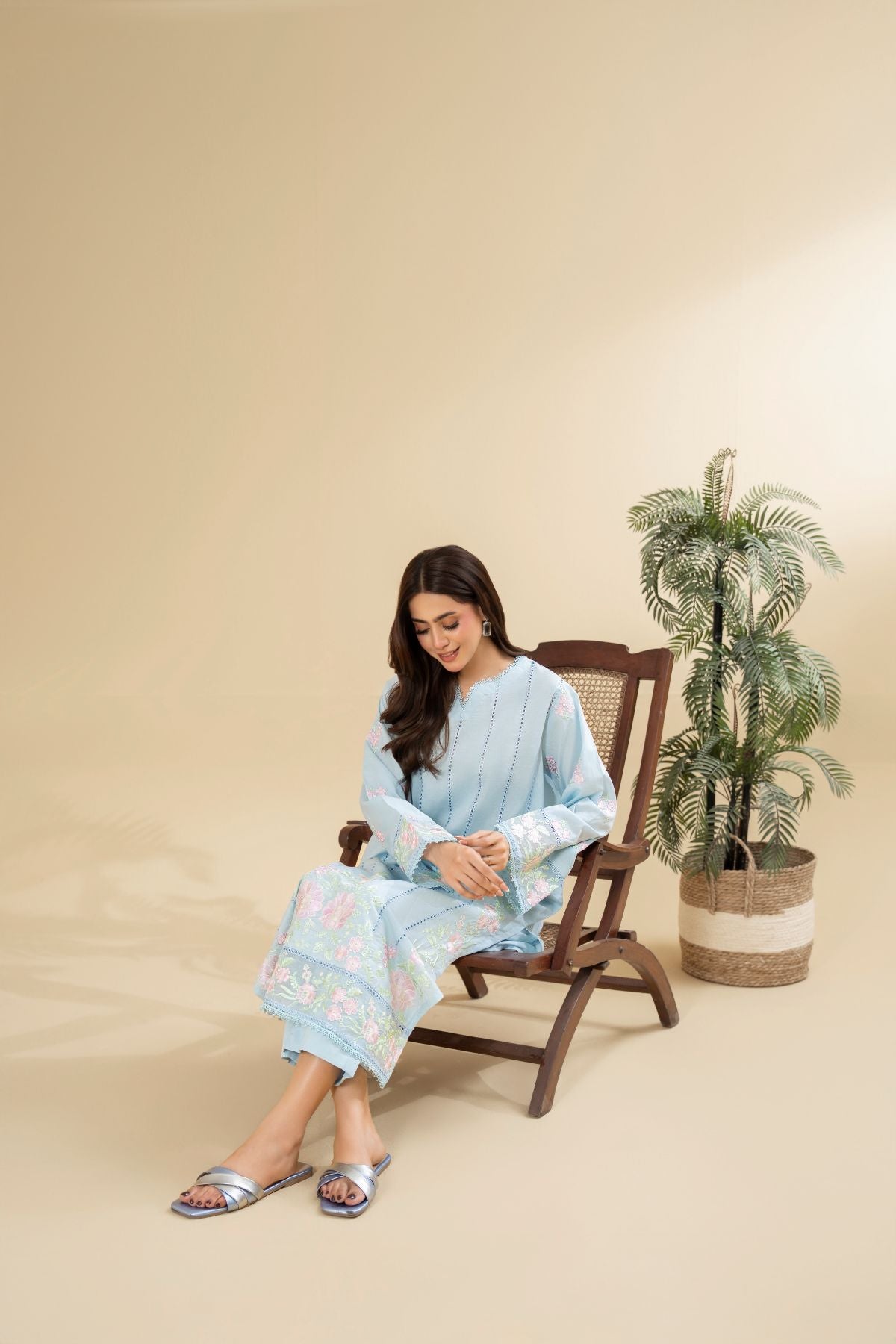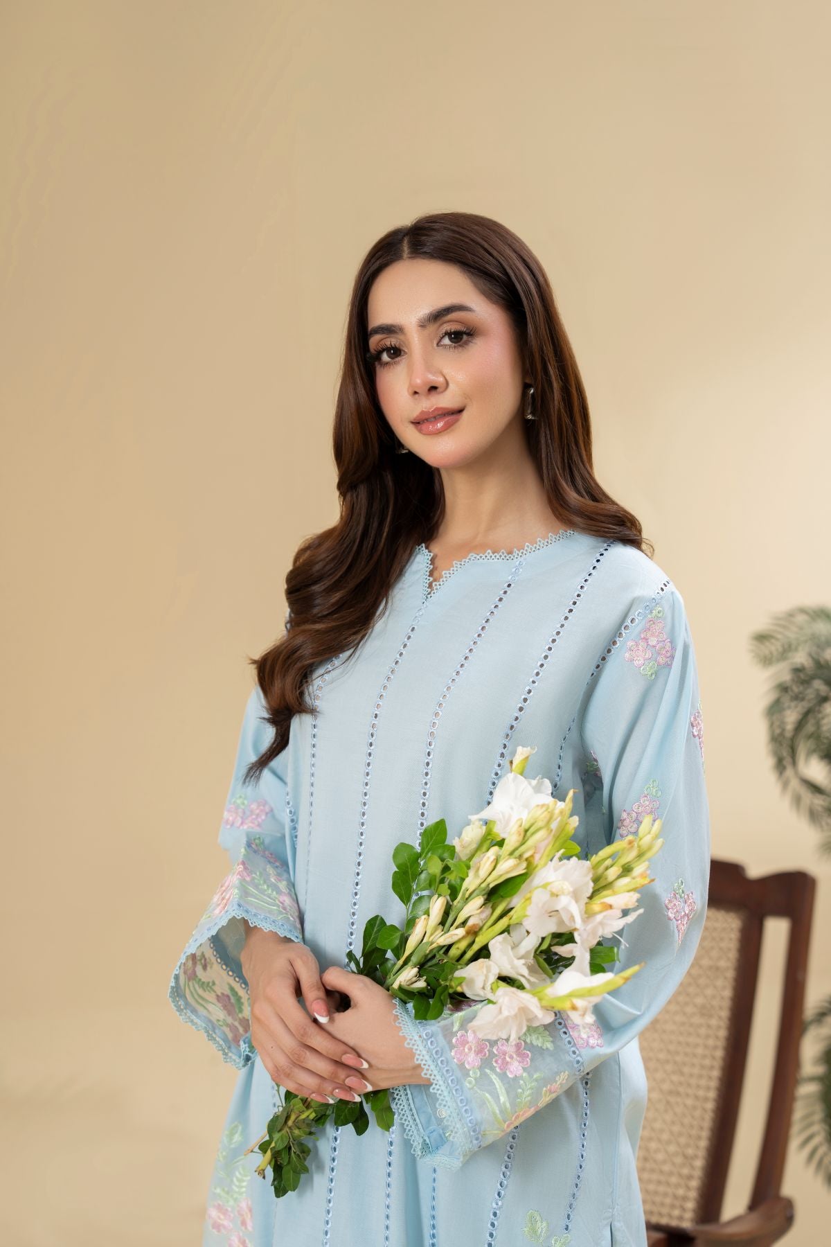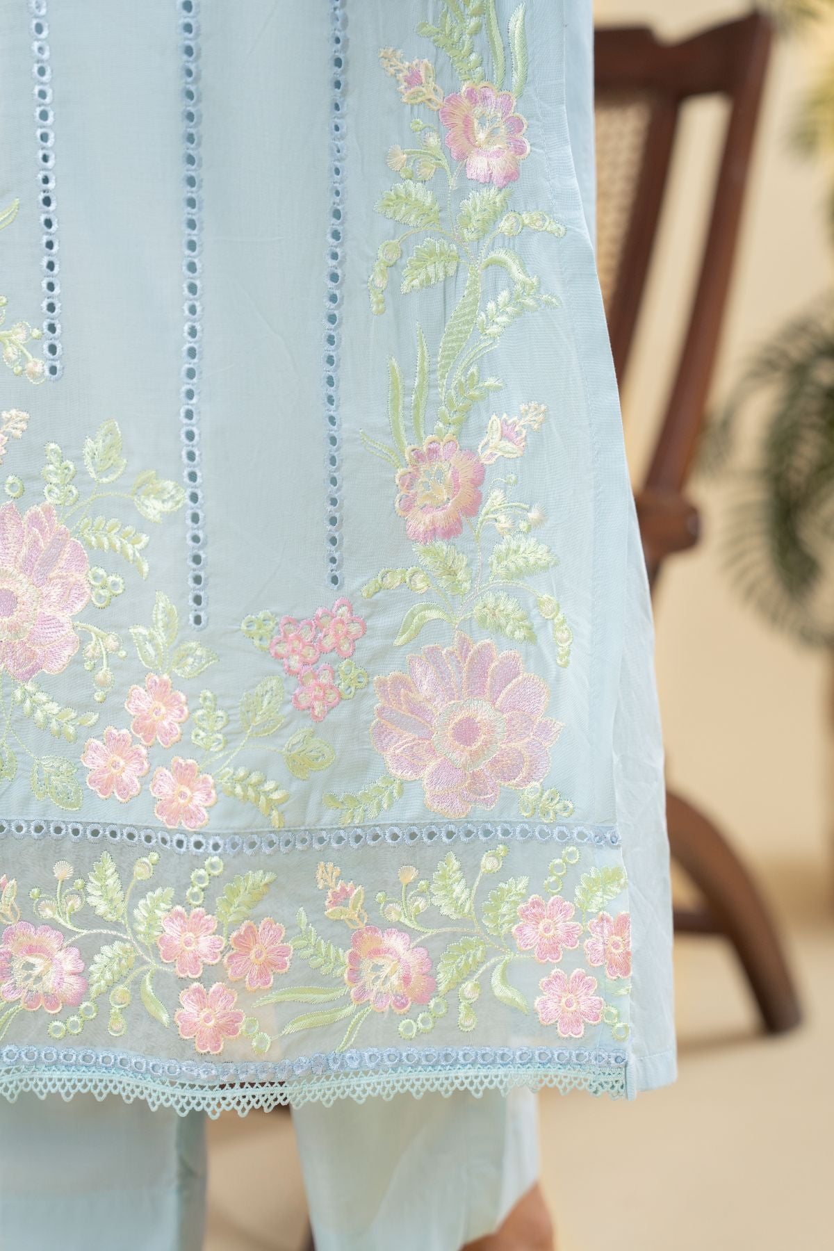 Drift into serene elegance with Skyline Gleam, a captivating ensemble in a refreshing sky blue hue. The kameez is beautifully adorned with delicate floral embroidery in soft pinks and greens, creating a graceful vertical design that flows to the hem and sleeves. Paired with coordinating pants, Skyline Gleam offers a soothing yet sophisticated aesthetic, perfect for a refined daytime look.