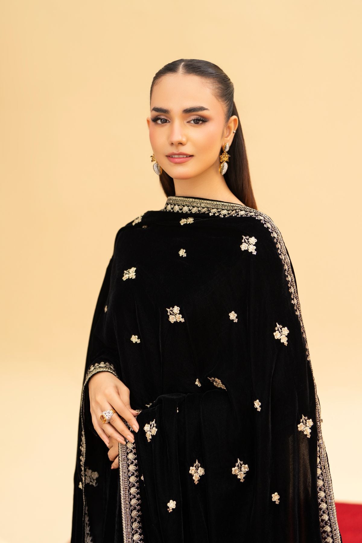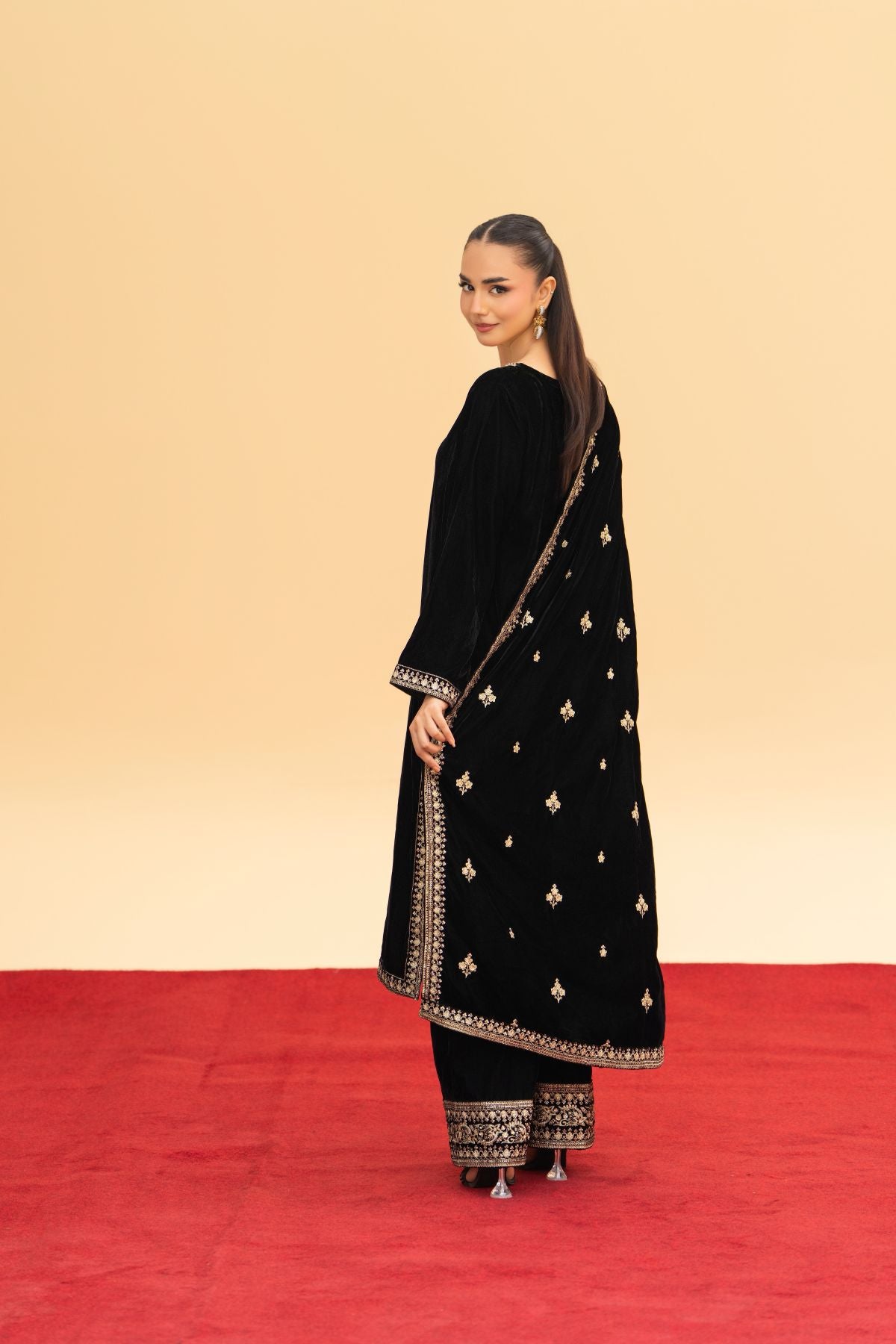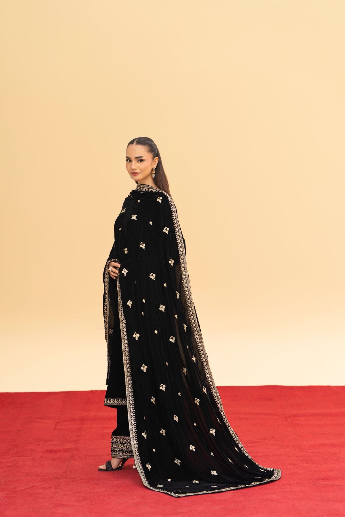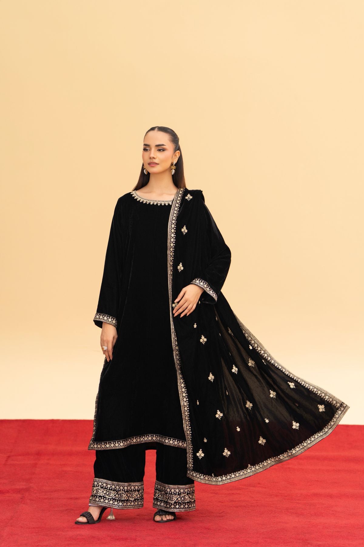 A masterpiece of regal allure. Crafted from luxurious black velvet, this festive ensemble features intricate embroidery that glimmers with timeless elegance. Paired with an exquisitely embroidered velvet shawl, it radiates warmth, depth, and sophistication. Perfect for evening gatherings and winter festivities, Velencia embodies the true essence of luxury and grace.