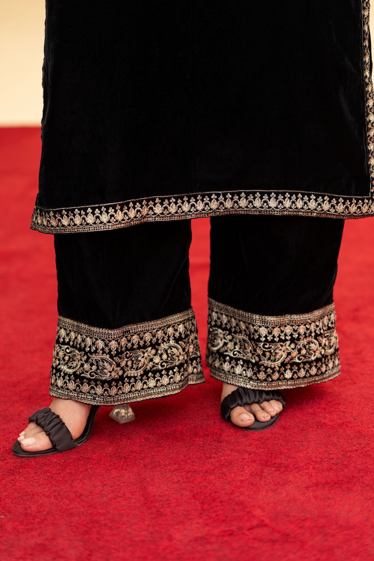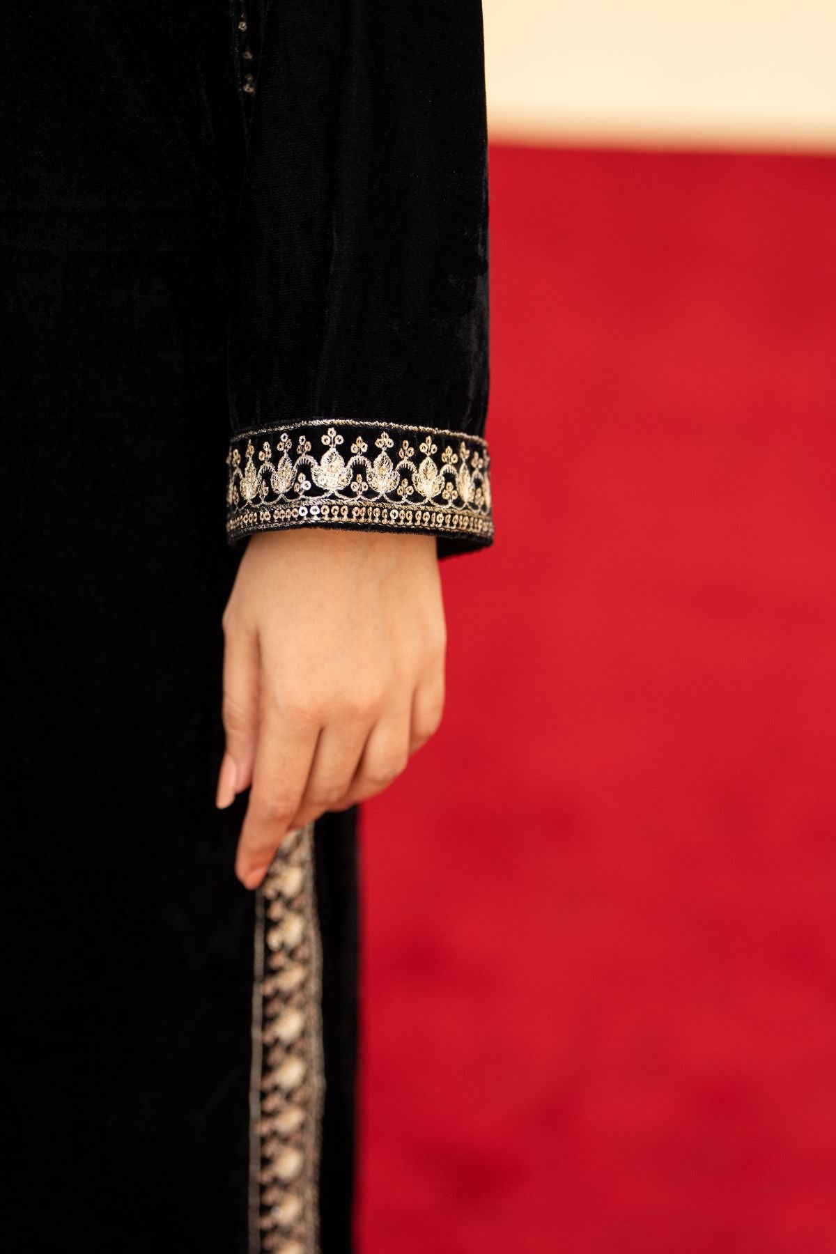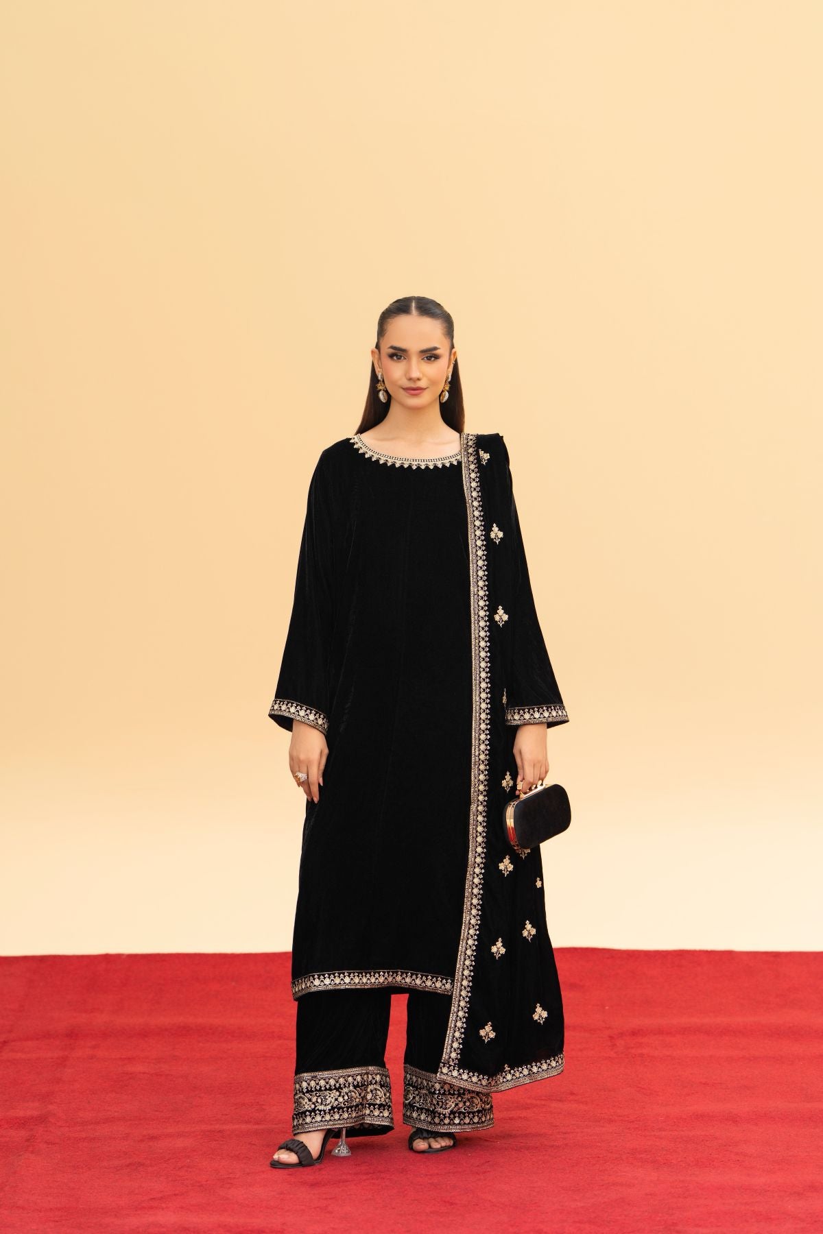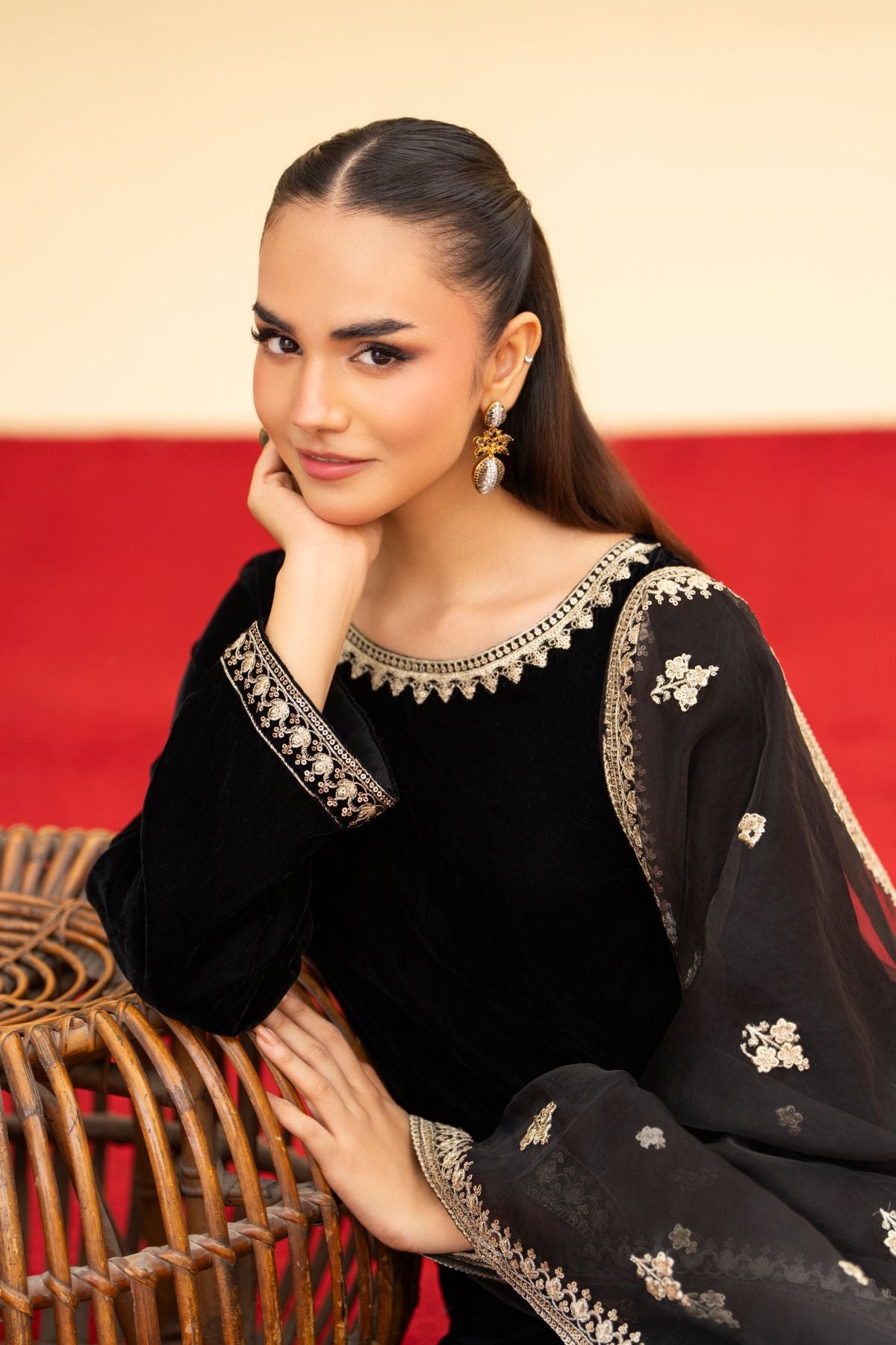 A masterpiece of regal allure. Crafted from luxurious black velvet, this festive ensemble features intricate embroidery that glimmers with timeless elegance. Paired with an exquisitely embroidered velvet shawl, it radiates warmth, depth, and sophistication. Perfect for evening gatherings and winter festivities, Velencia embodies the true essence of luxury and grace.
